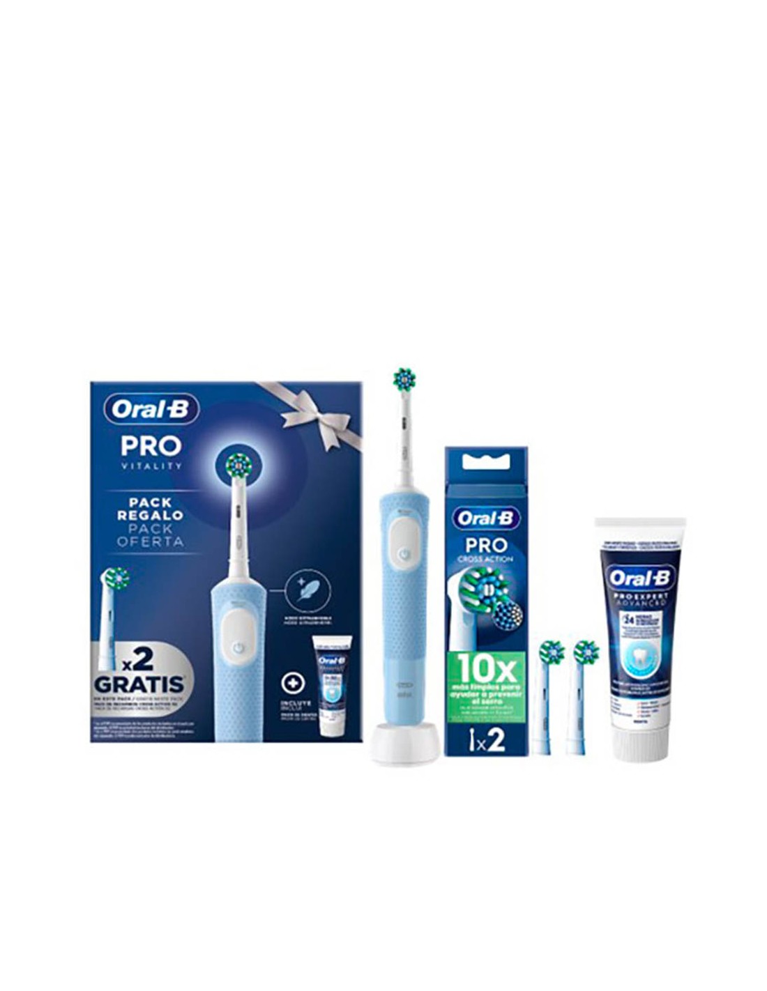 Cepillo eléctrico oral-b pro vitality + 2 recambios + pasta advance, incluye cargador temporizador profesional para 4 zonas (2 min), cabezal redondo cross action de filamentos con ángulo perfecto para alcanzar profundamente las zonas interdentales, con mango resistente al agua y batería de larga duración