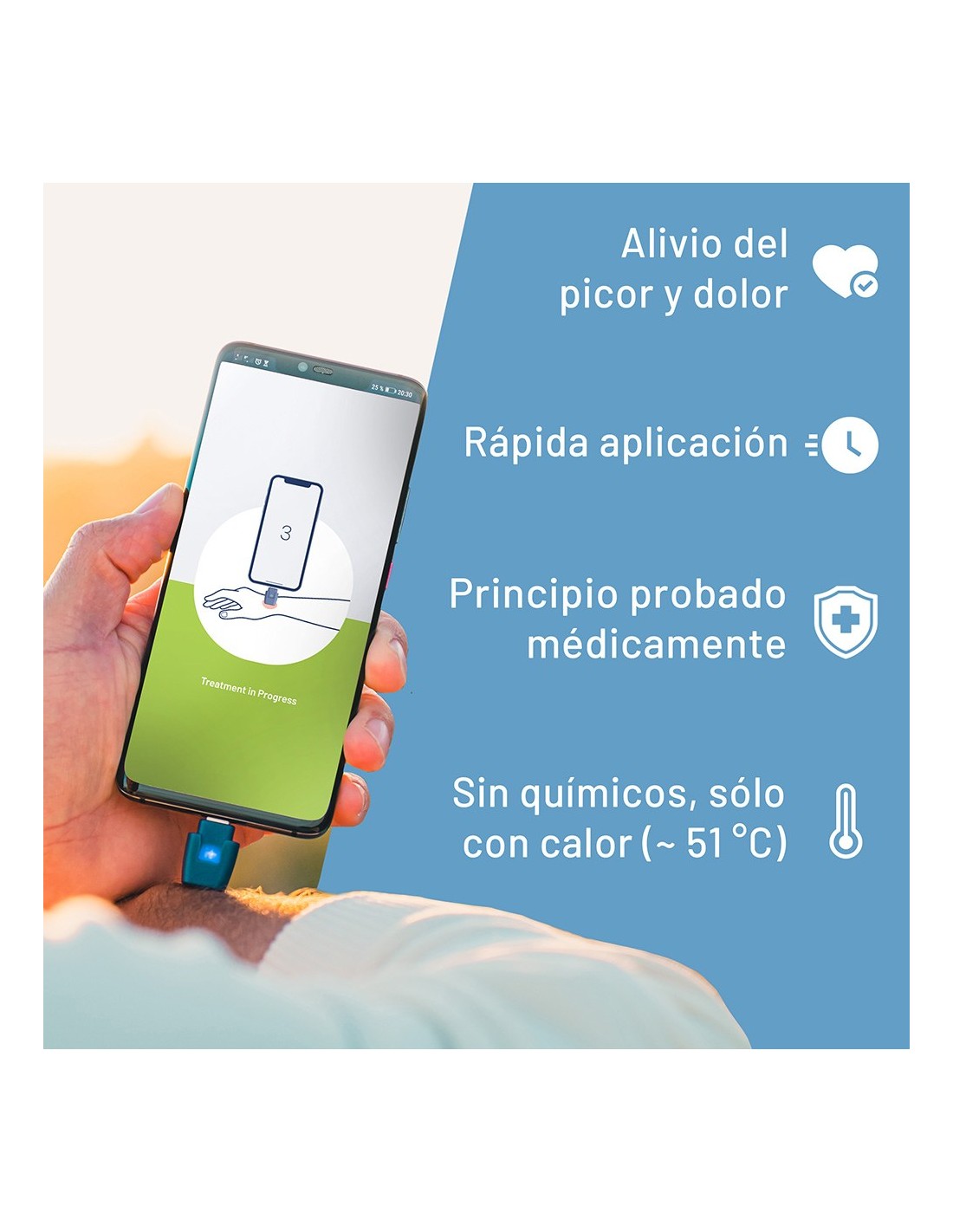 Dispositivo médico para el tratamiento de picaduras de insectos mediante la aplicación de calor sin químicos. funciona con calor a través de la app exclusiva de la marca y se aplica durante 4-9 segundos. se ajusta a la sensibilidad de la piel, apto para niños +3 años. formato llavero. con conexión usb-c. compatible con android y apple hasta iphone 15. presentado en expositor de 12 uds. dimensiones: 3.7 x 1.7 x 0.9 cm