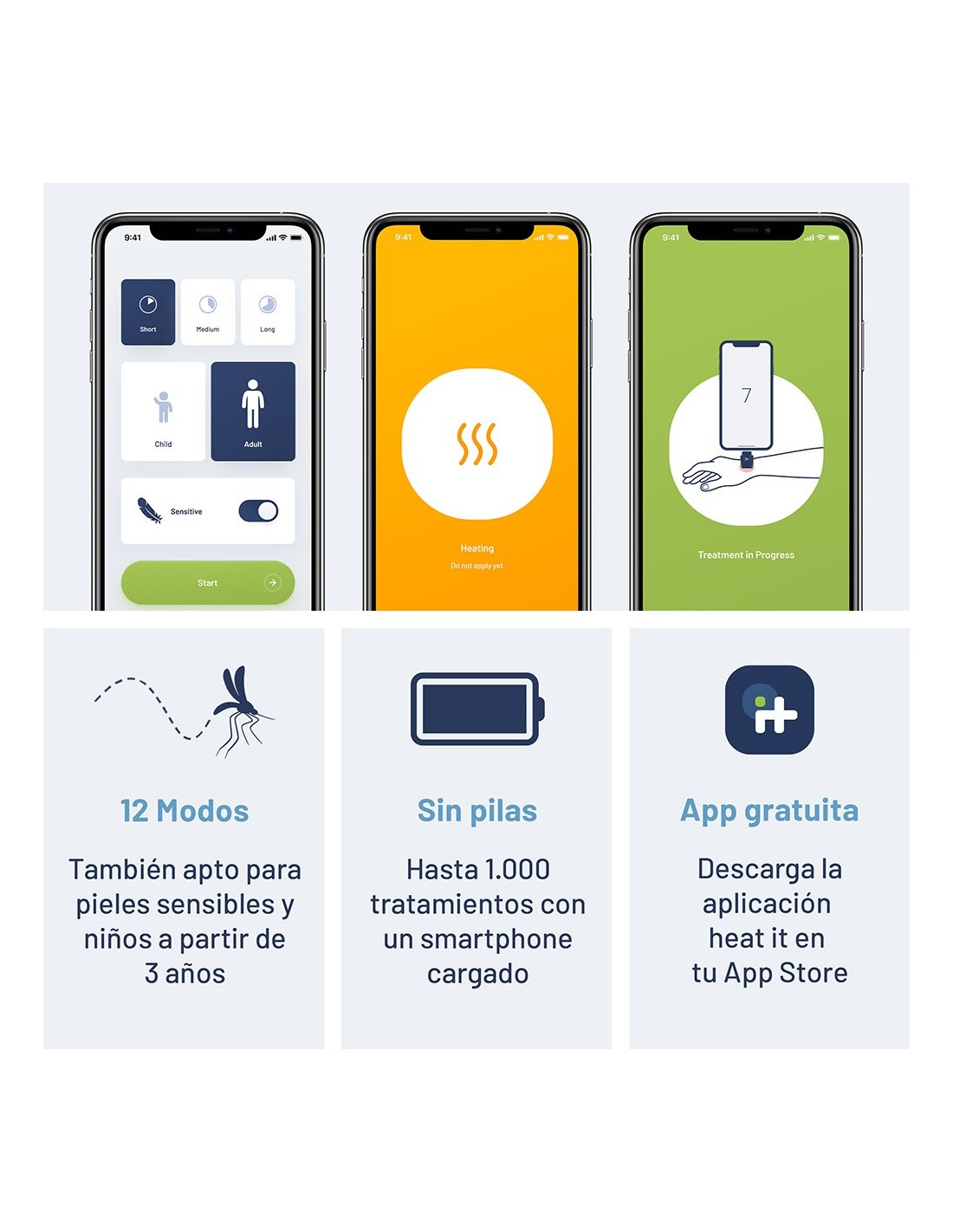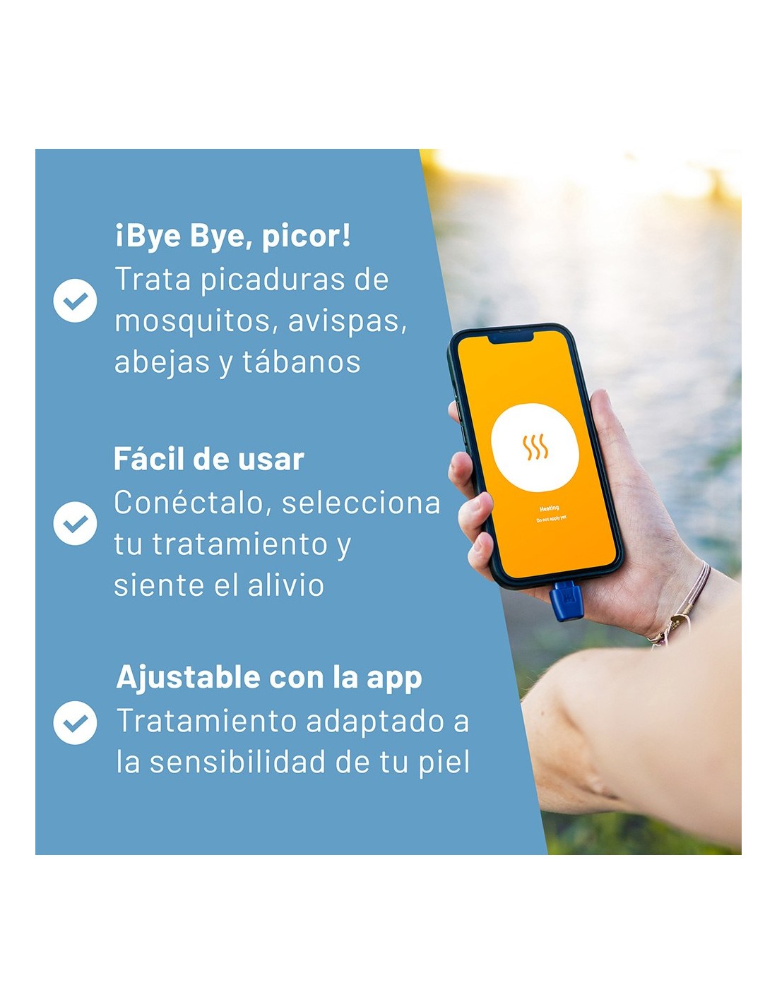 Dispositivo médico para el tratamiento de picaduras de insectos mediante la aplicación de calor sin químicos. funciona con calor a través de la app exclusiva de la marca y se aplica durante 4-9 segundos. se ajusta a la sensibilidad de la piel, apto para niños +3 años. formato llavero. con conexión lightning. compatible para iphone 6s hasta iphone 14. presentado en expositor de 12 uds. dimensiones: 3,7 x 1,7 x 0,9 cm