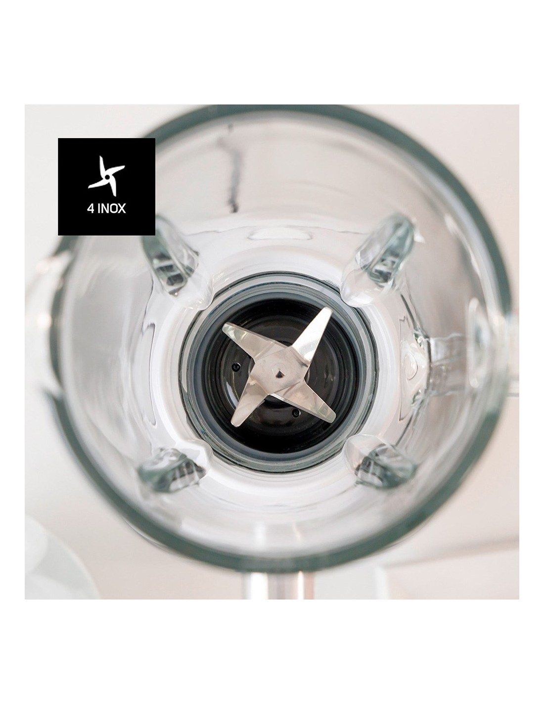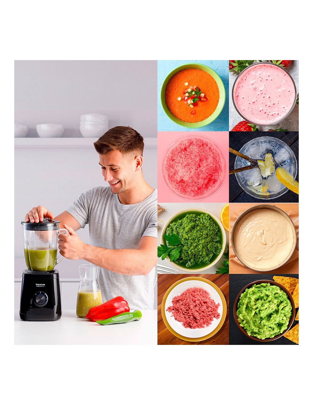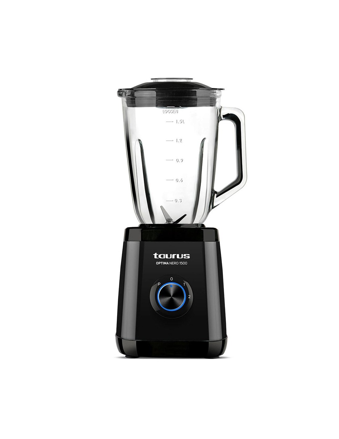 Batidora de vaso optima nero 1500 w con jarra de cristal graduada de 1,5 l, 2 velocidades + pulse/pica hielo, cuchilla desmontable de 4 filos de acero inoxidable. boca de vertido en la jarra, pies antideslizantes y sistema de seguridad permitiendo que sólo se active cuando la jarra está bien colocada. jarra y cuchillas aptas para lavavajillas