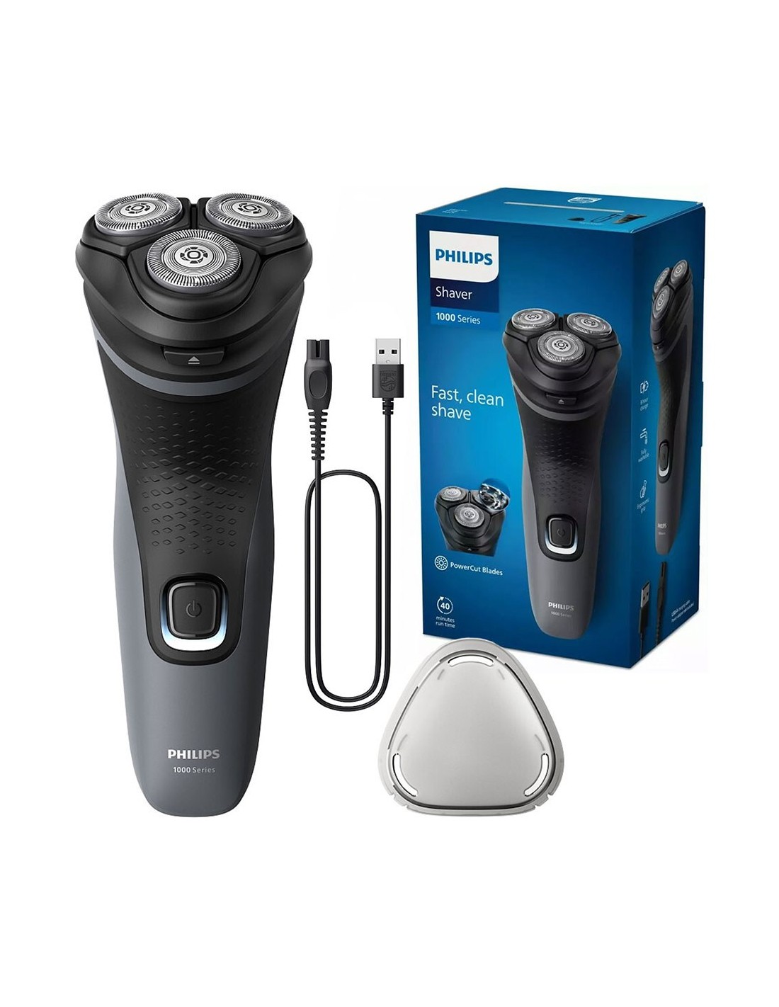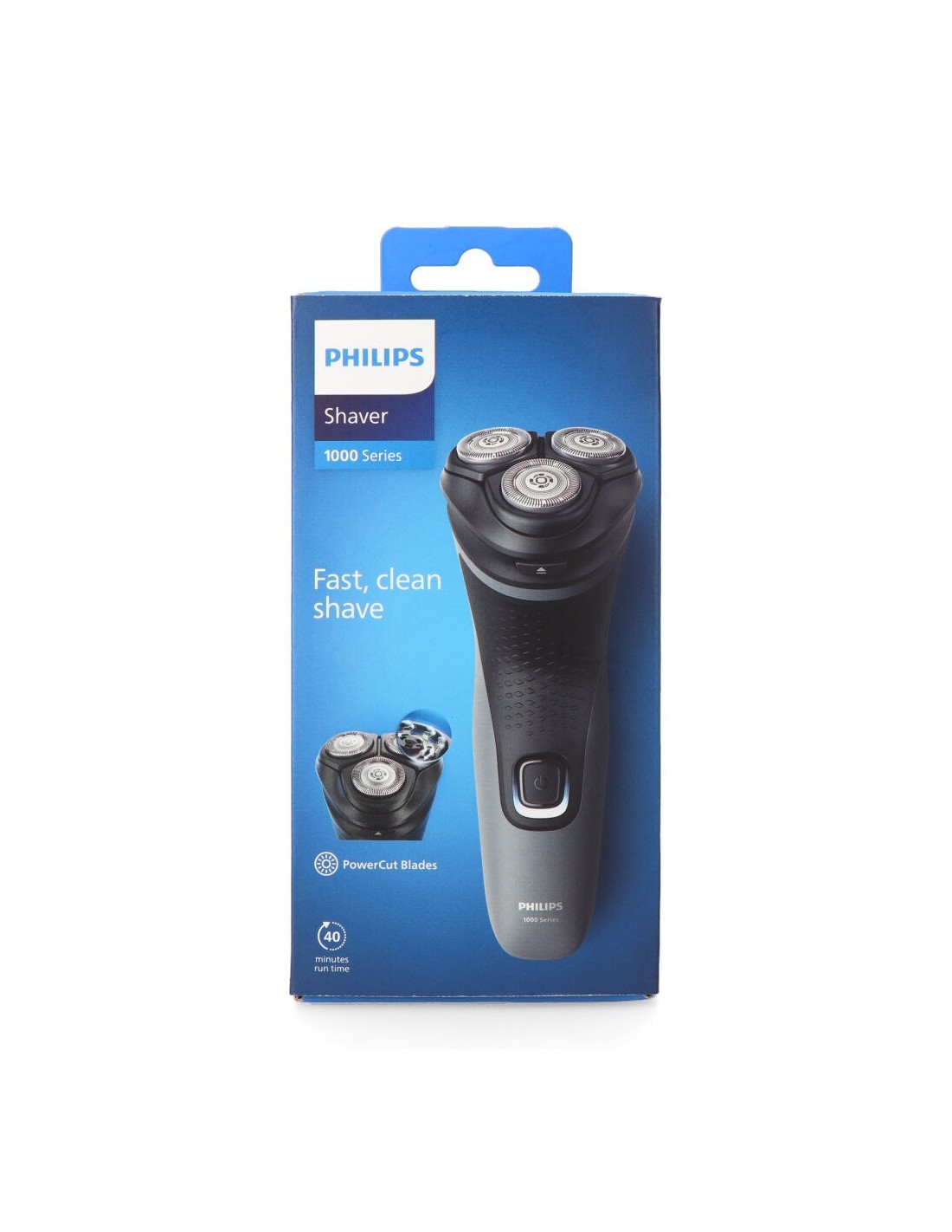 Afeitadora 3 rodillos recargable 1000 series con tecnología de cuchillas powercut autoafilables para un afeitado apurado. cabezales flexibles 4d que se adaptan al contorno del rostro. resistente al agua, apto para uso en la ducha. ergonómica y ligera. duración estimada de la batería: hasta 40 min sin cable tras 8 h de carga