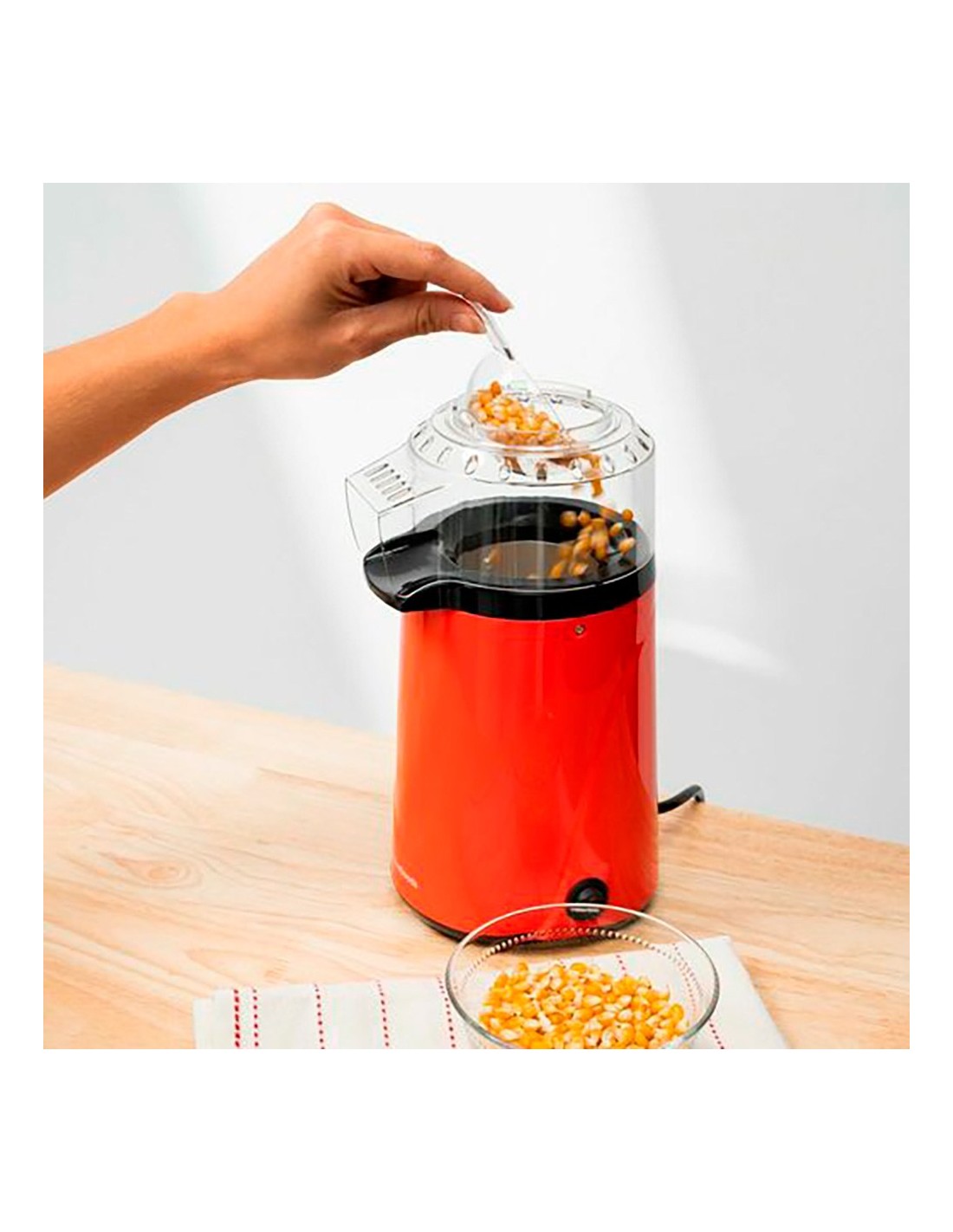 Palomitera popmar de aire caliente 1200 w, 220 - 240 v ~50/60 hz, con termostato de seguridad 200°c +/- 20° c, no necesita aceite ni mantequilla, incluye cacito medidor, material pp, pc y aluminio. dimesiones 13,5 x 15 x 26 cm