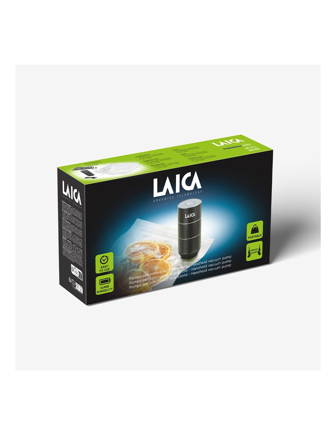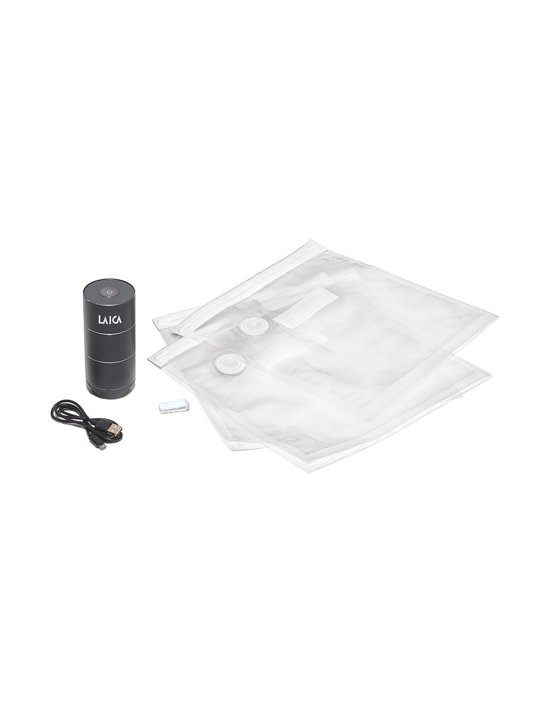 Bomba de vacío portátil, con batería de litio recargable con duración estimada de 70 min, fabricada en metal, funcionamiento automático, compatible con los recipientes de vidrio para vacío vt3306 y vt3307 (no incluidos). incluye cable de carga micro usb, 2 piezas para cerrar las bolsas herméticamente y 10 bolsas reutilizables vt3522 de 20 x 23 cm. dimensiones: ø4,9 x 11 cm