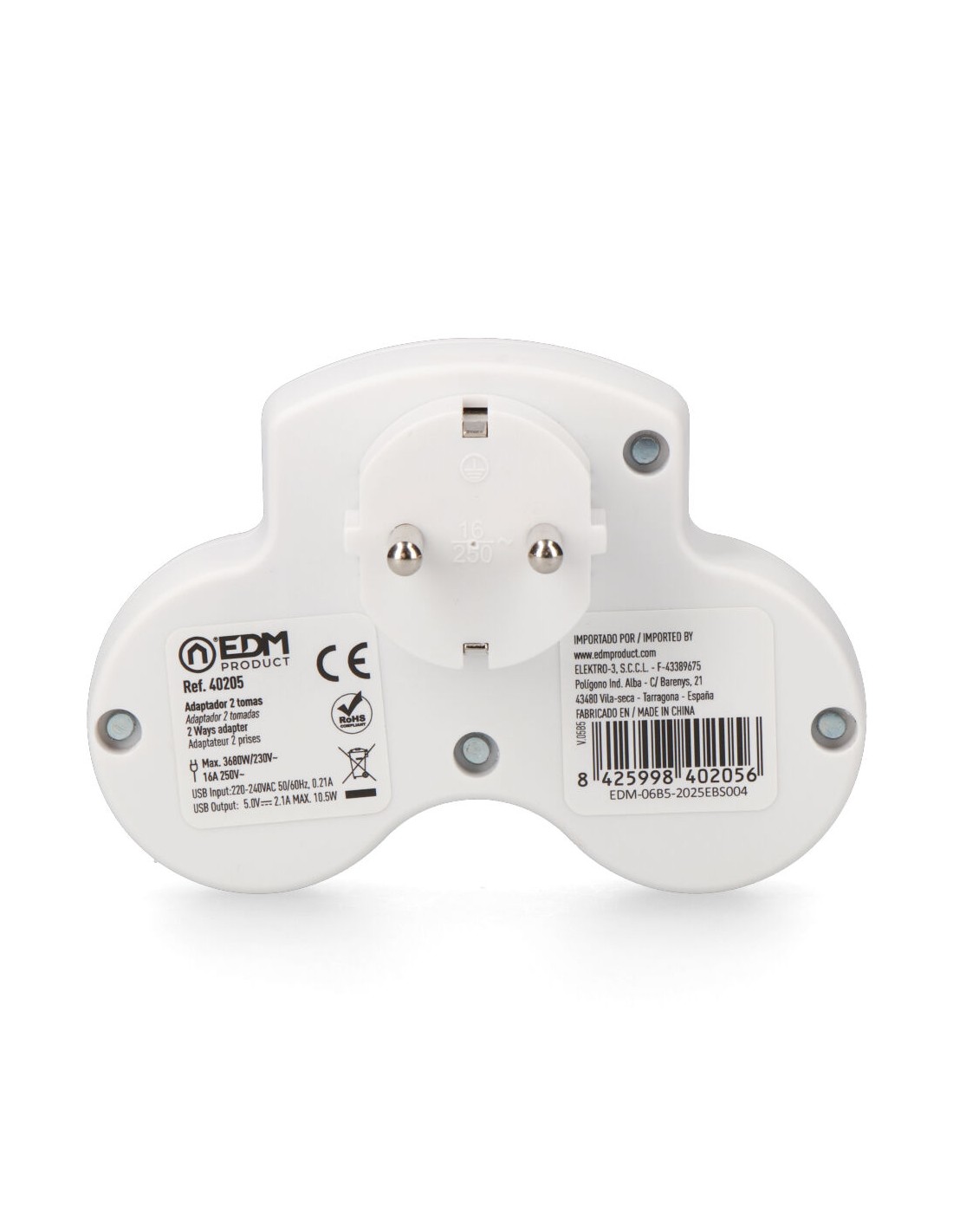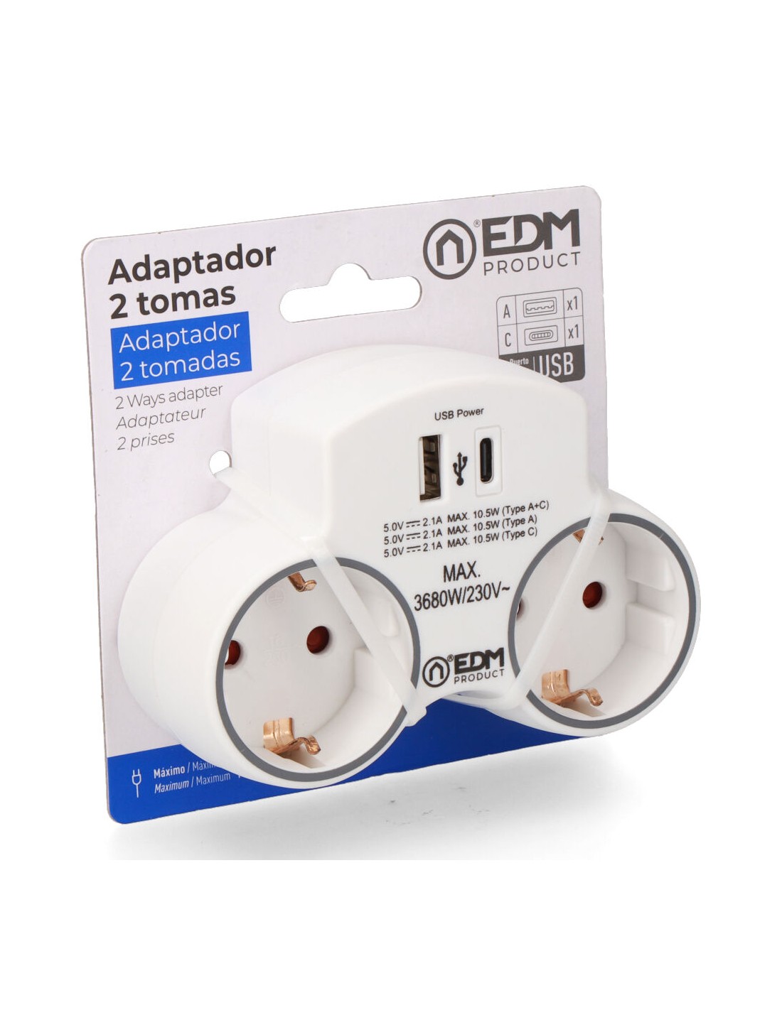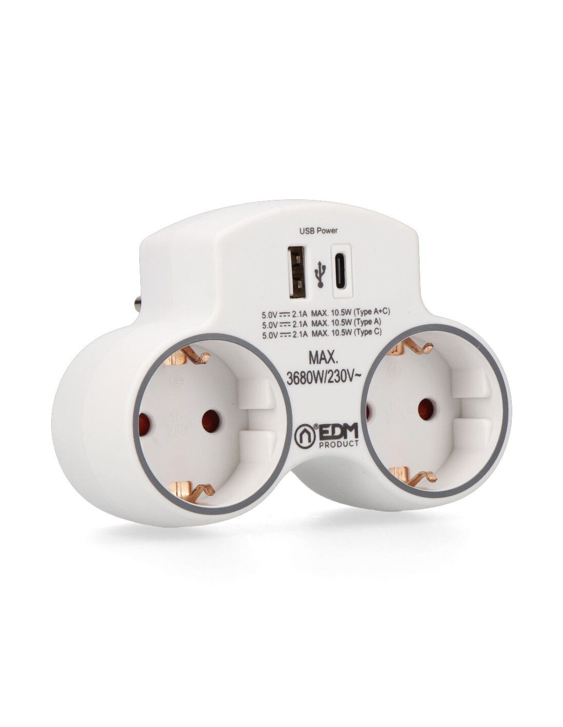 Adaptador 2 tomas 2p+t schuko con 2 usb (a + c) 5,0 v dc 2,1 a total 10,5 w 3680 w / 230 v máximo, blanco 112 x 39,5 x 80 mm