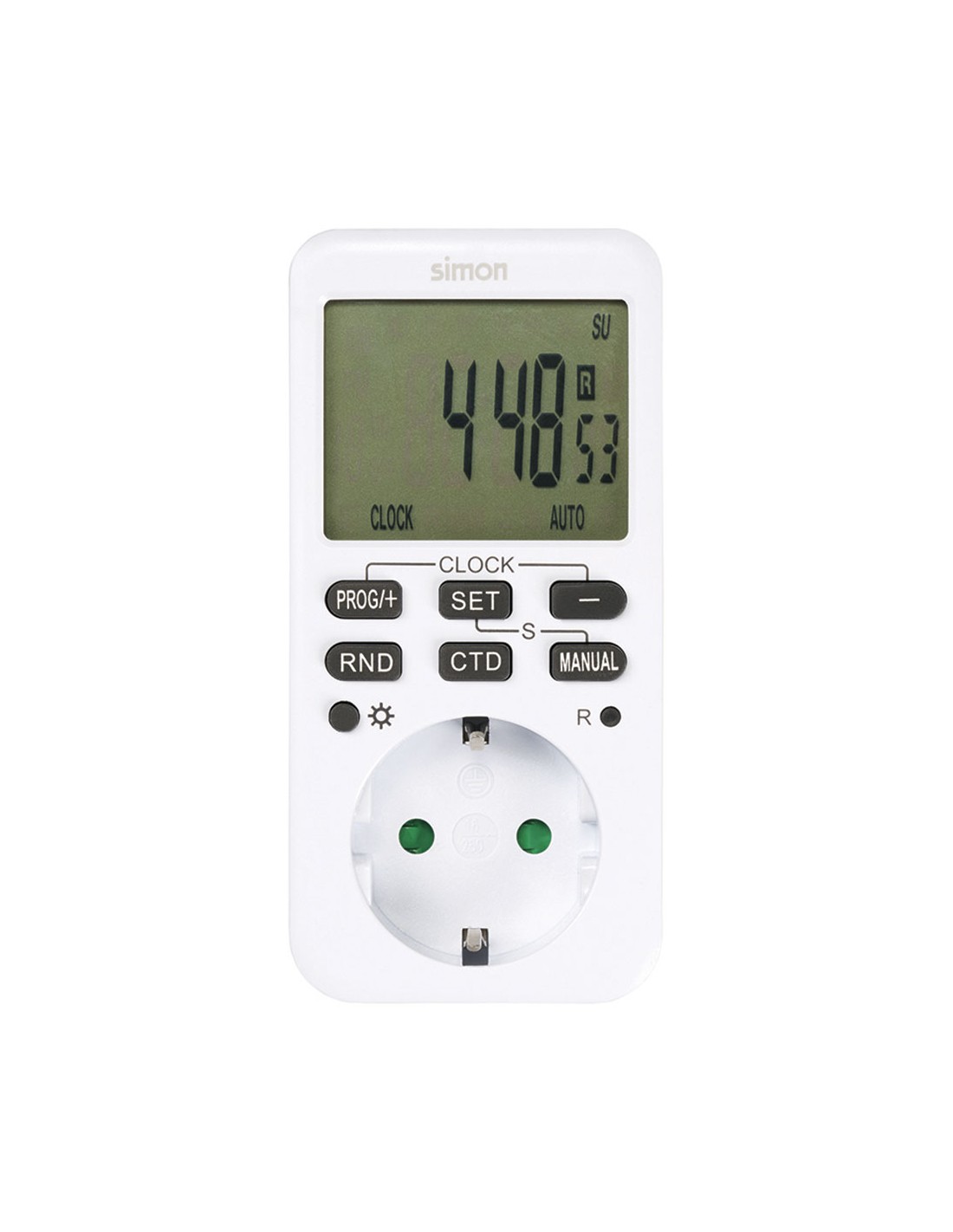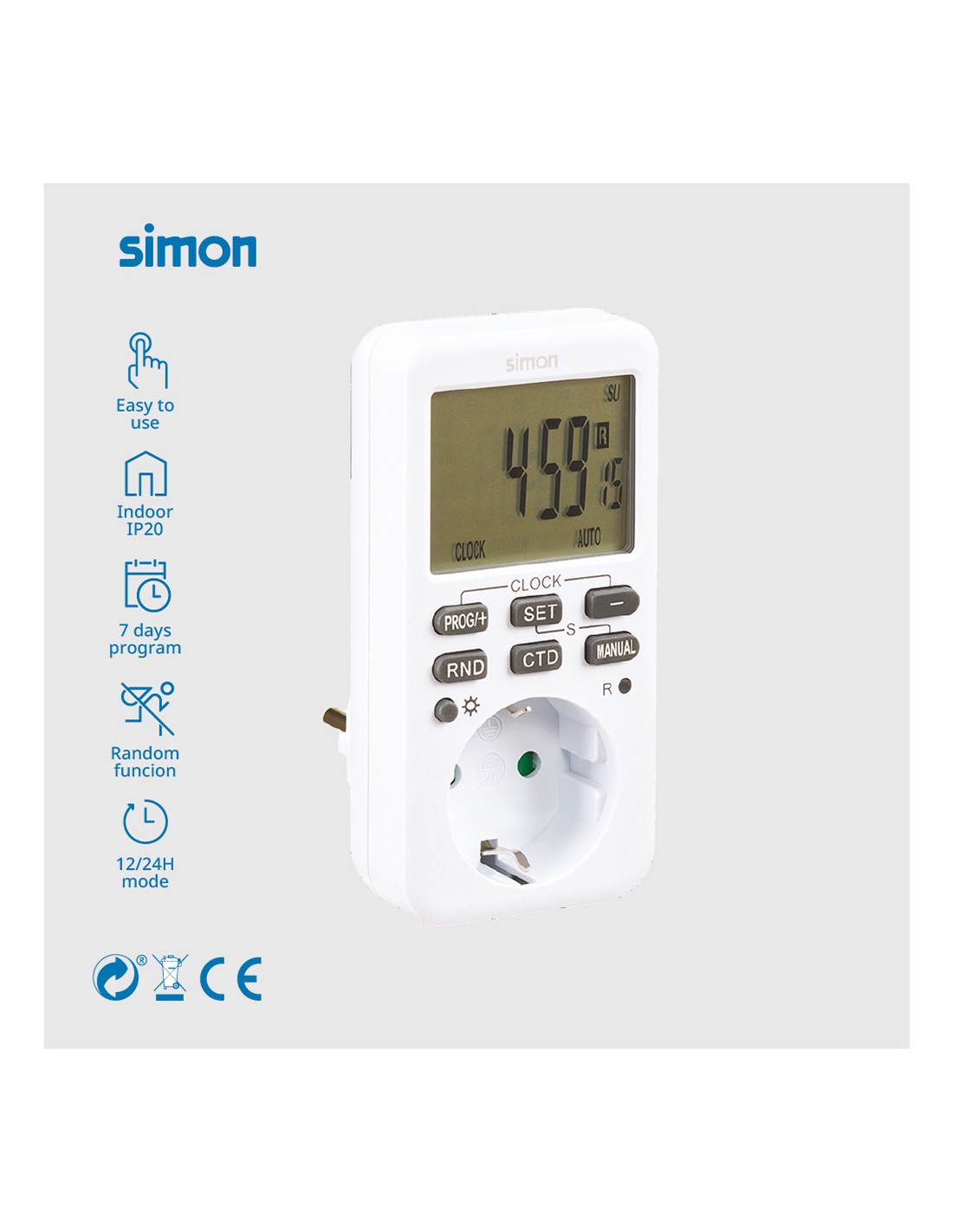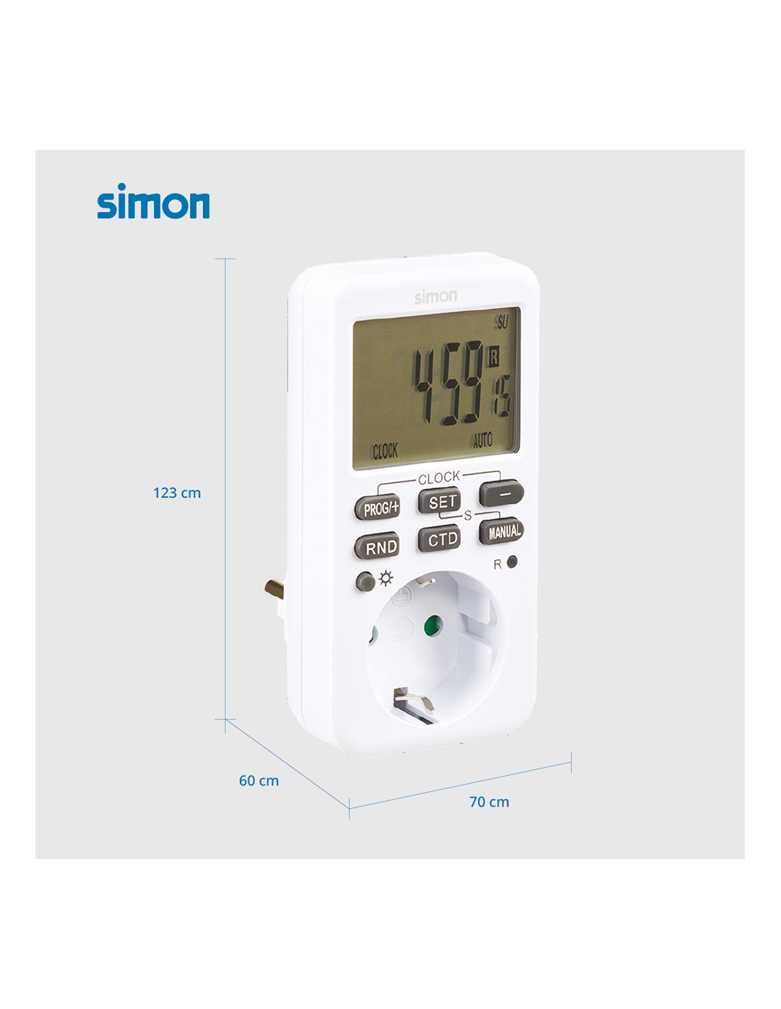 Programador digital af711202 semanal max. 3600 w, 16 a, 230 v ~50 hz solución para el control energético y seguridad del hogar hasta 10 programas on/off con intervalos de 1 minuto modo 12/24 h función de simulación de presencia, función cuenta atrás función de horario de verano disponible pantalla lcd retroiluminada batería de respaldo y protección infantil temporizador eficiente, práctico y seguro, para interior ip20