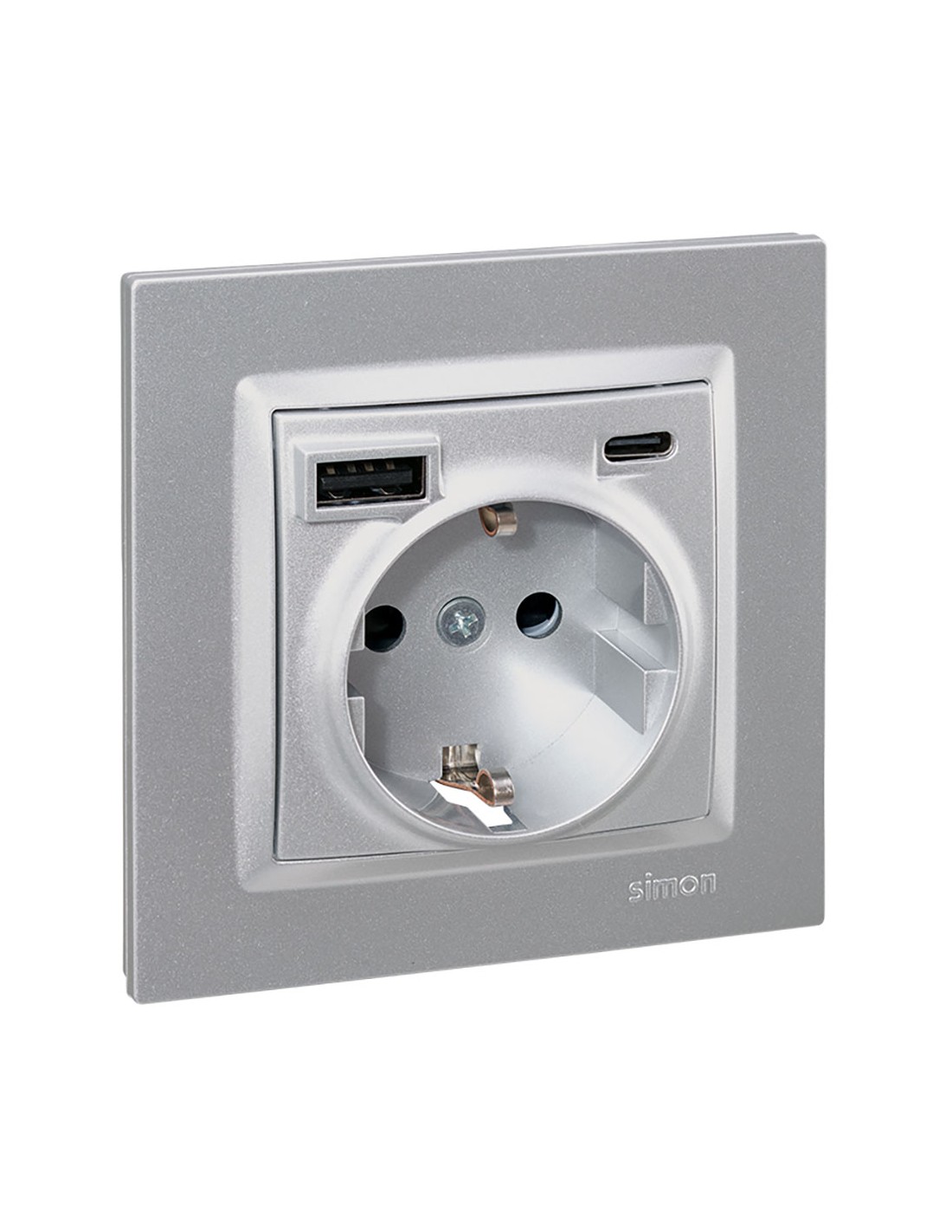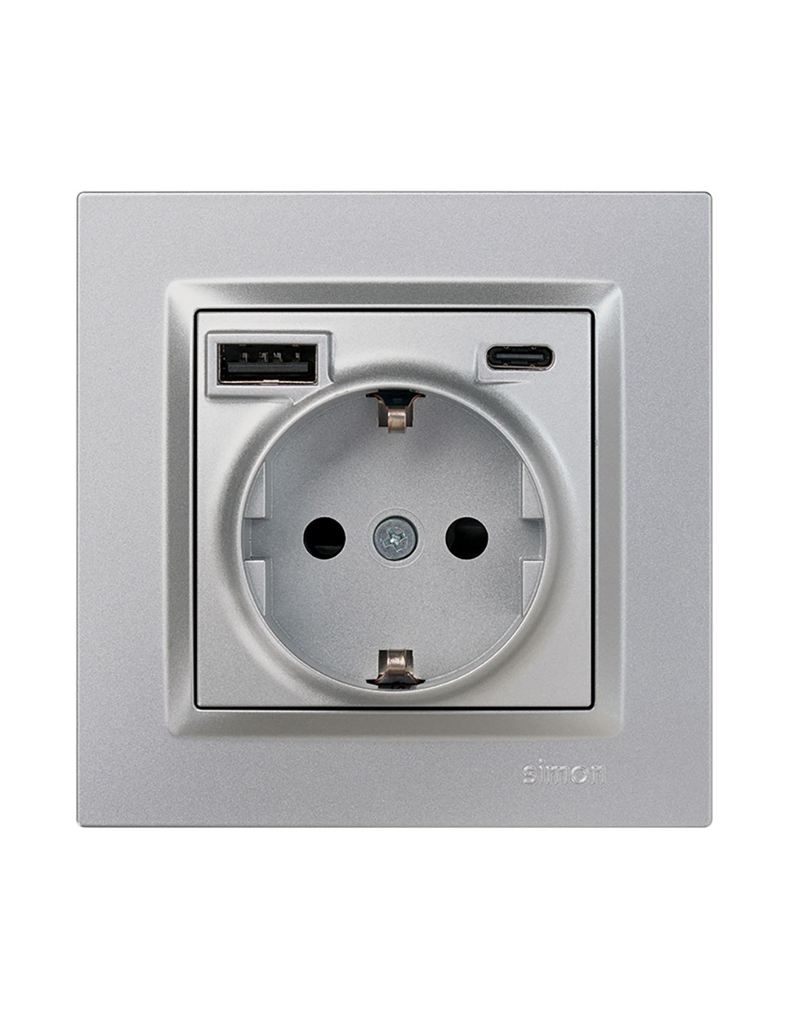 Base enchufe schuko de empotrar 1 toma 16 a + usb a+c 10,5 w serie simon 10, permite conectar aparatos de hasta 16 a y 250 v mientras se cargan móviles u otros dispositivos a través de los puertos usb a y c se compone de mecanismo, tapa y marco bastidor de polipropileno flexible y garras metálicas color aluminio