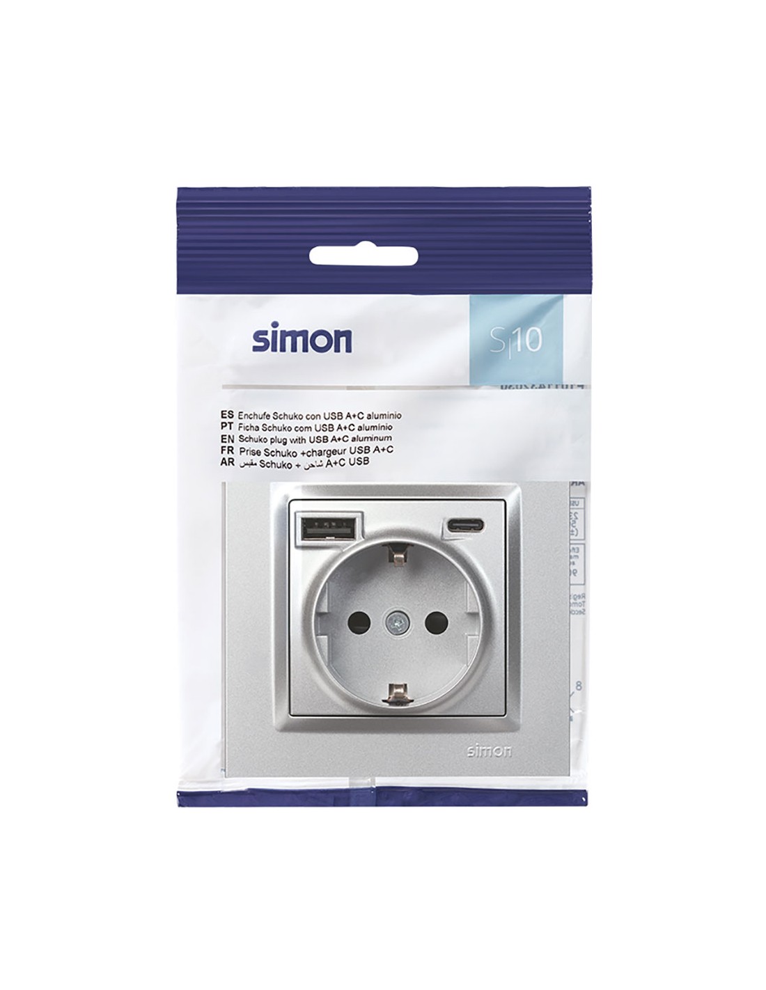 Base enchufe schuko + usb a + c 10,5 w 16 a 250 v~, simon 10, aluminio