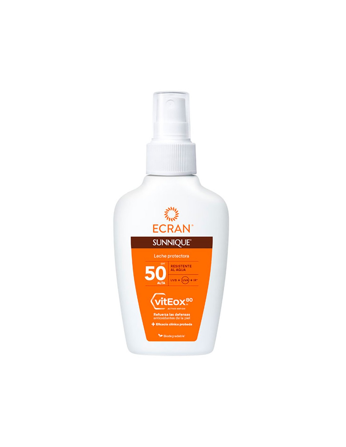 Leche protectora solar en spray spf50 100 ml ideal para viajar. resistente al agua, refuerza las defensas antioxidantes de la piel y no pica en los ojos