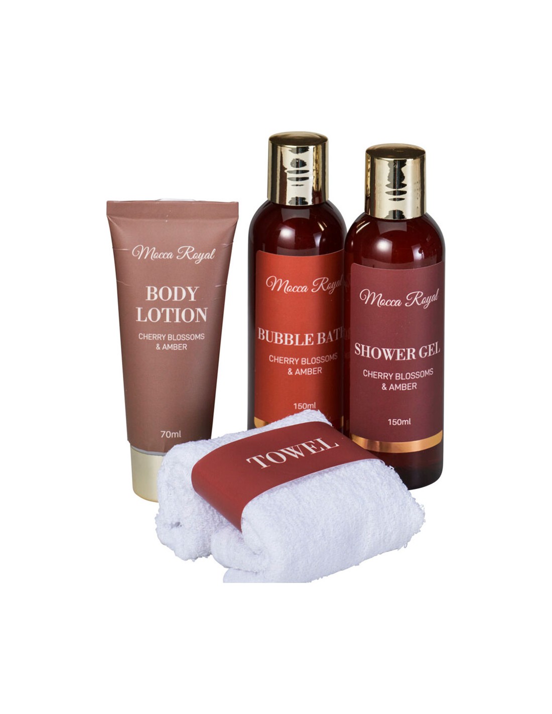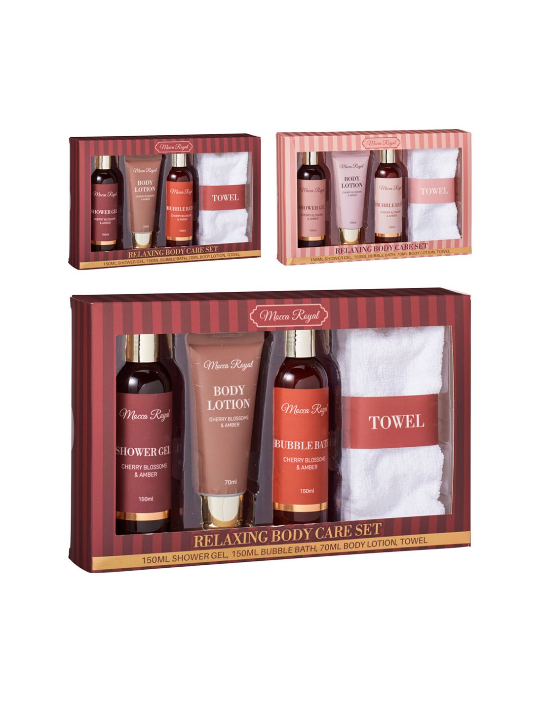 Estuche relaxing body care set compuesto por gel de ducha de 150 ml, loción corporal en tubo de 70 ml, baño de burbujas de 150 ml y toalla