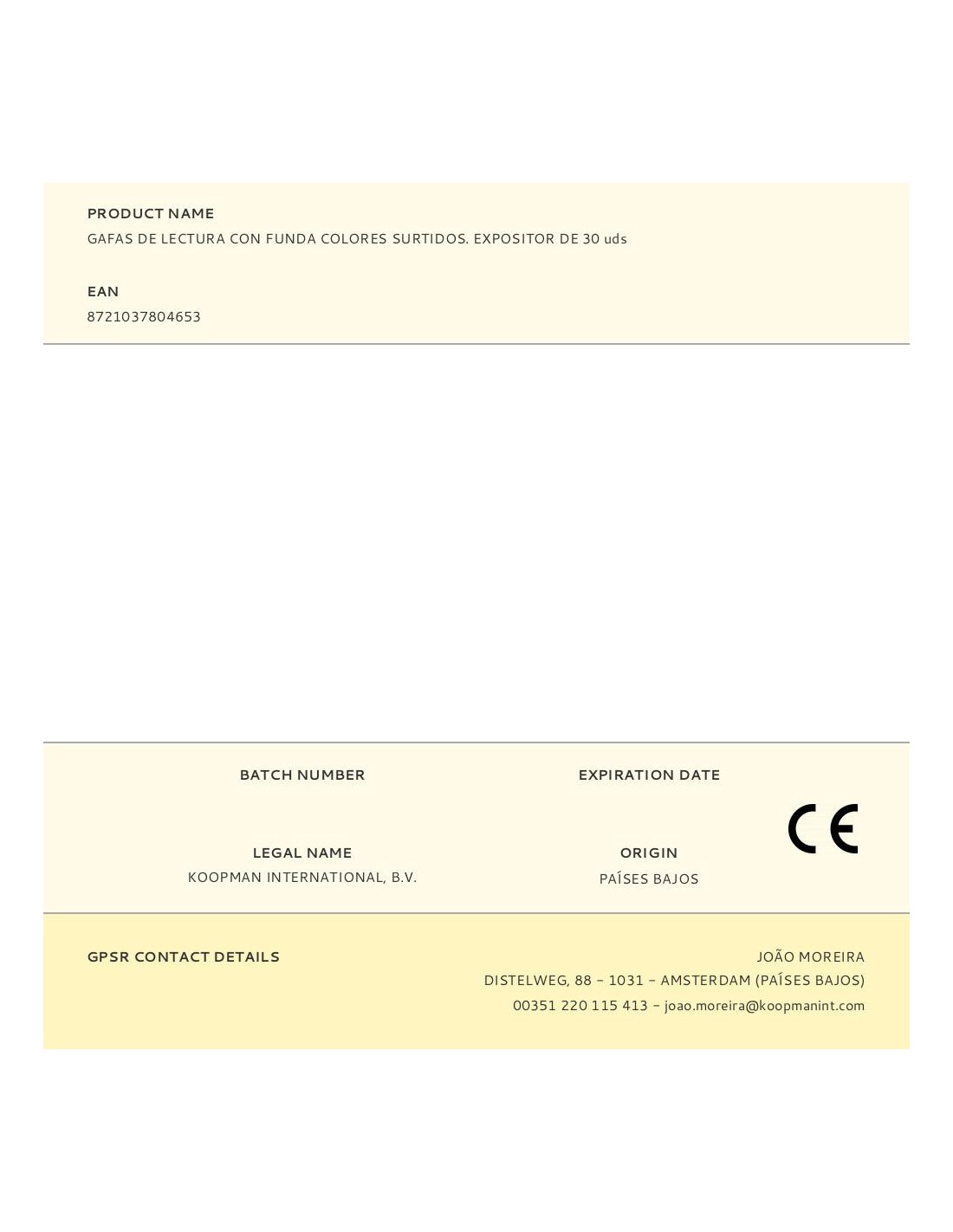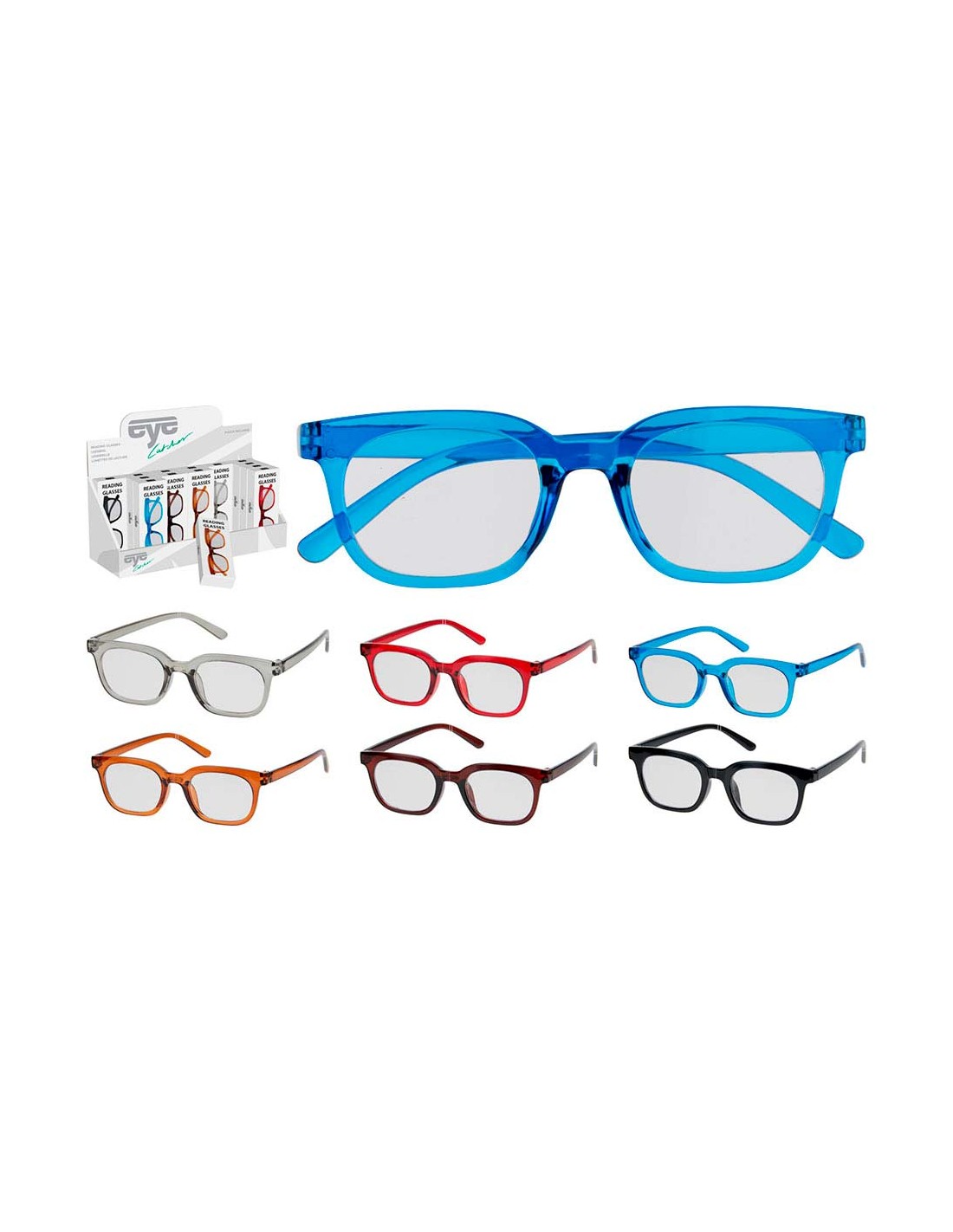 Gafas de lectura con funda, dioptrías +1, +1,5, +2, +2,5, +3. presentada en expositor de 30 uds, colores surtidos