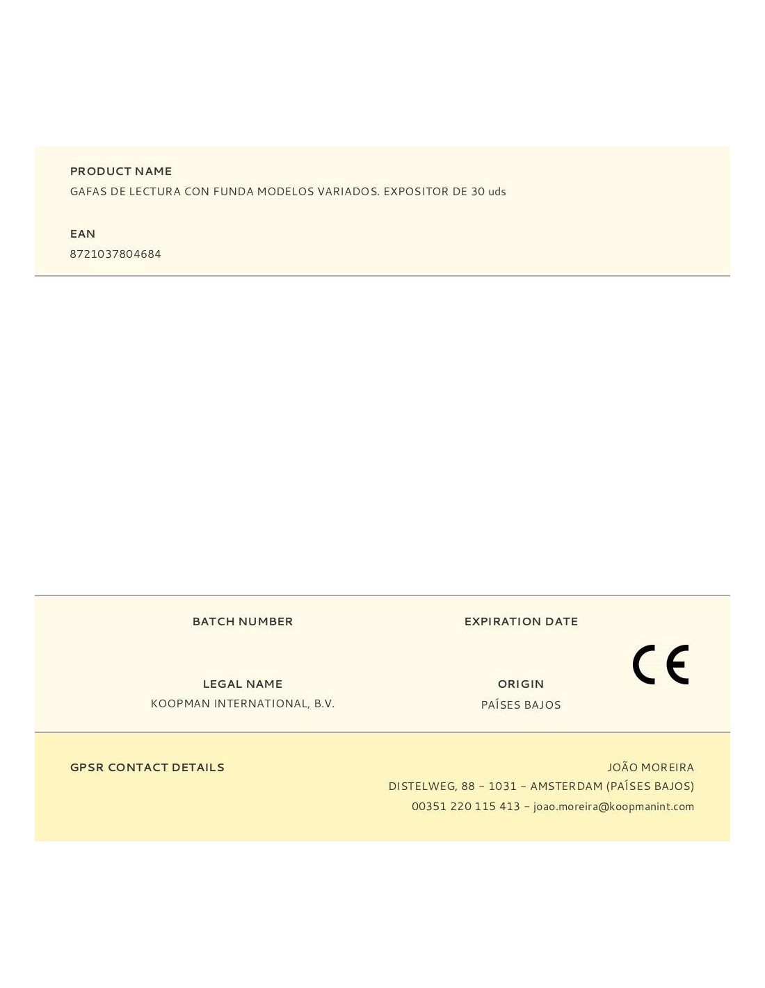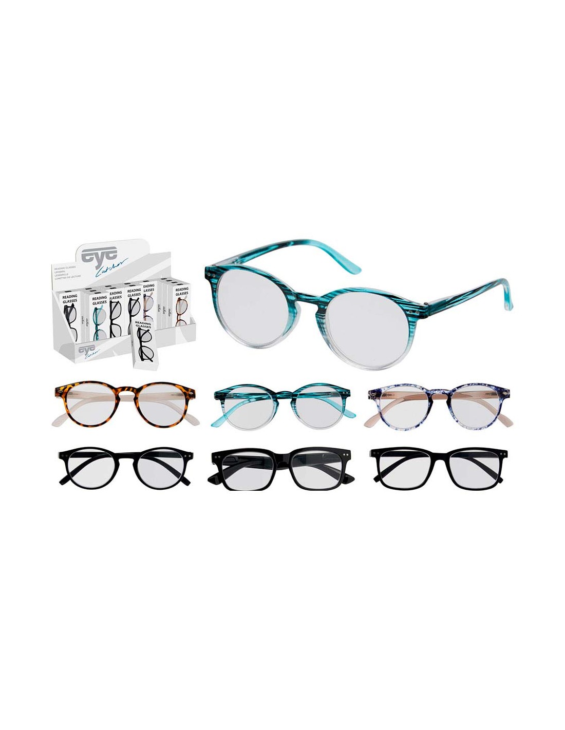 Gafas de lectura con funda, dioptrías +1, +1,5, +2, +2,5, +3. presentada en expositor de 30 uds, modelos variados
