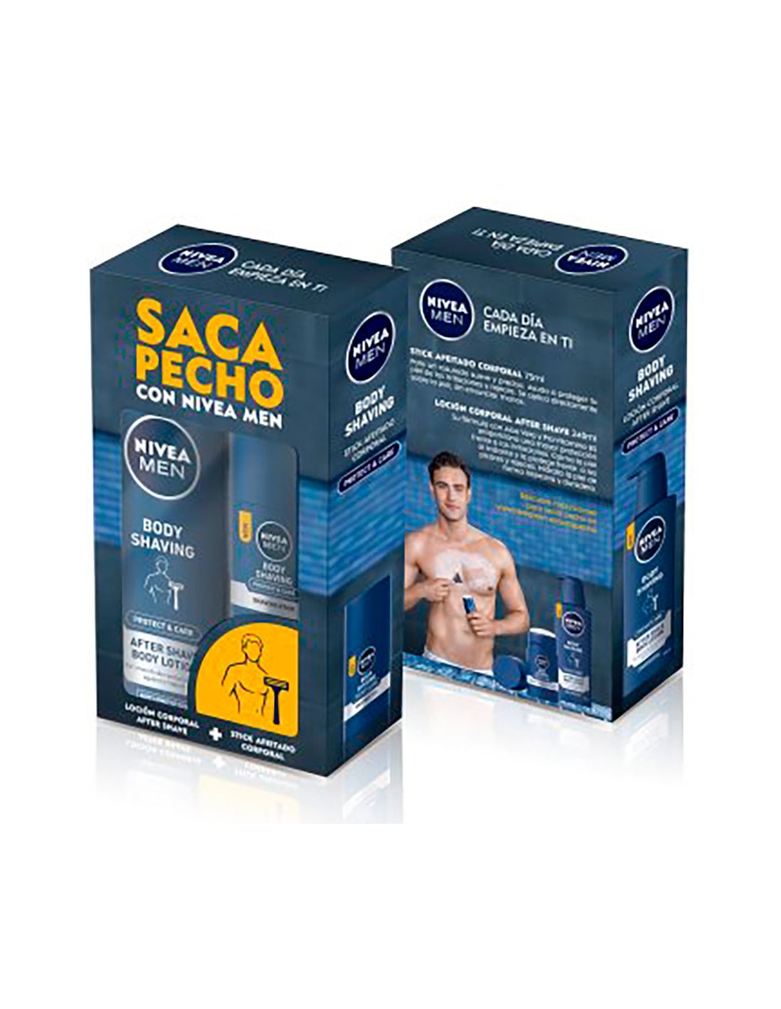 Stick afeitado corporal de 75 ml, para un rasurado suave y preciso se aplica directamente sobre la piel, sin ensuciar las manos, y loción corporal after shave de 240 ml con aloe vera y pro-vitamina b5, que proporciona una mayor protección frente a las irritaciones, hidrata la piel de forma intensiva y duradera