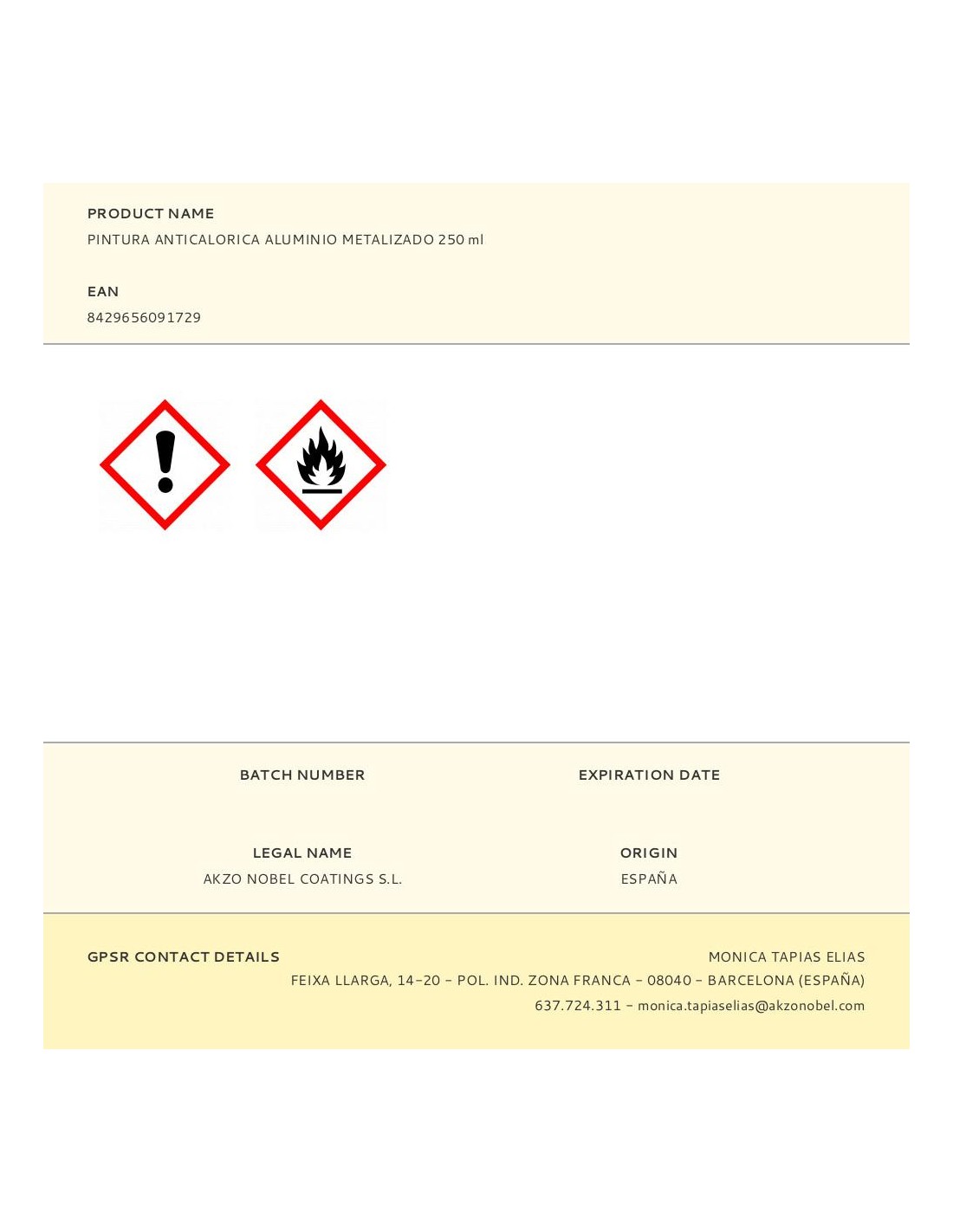 Pintura anticalórica aluminio metalizado 250 ml. esmalte de excepcional resistencia a altas temperaturas de hasta 400°c. fácil extensibilidad y larga duración. campos de aplicación: interior y exterior. especial para superficies metálicas que tengan que estar sometidas a altas temperaturas como: chimeneas, estufas, calderas, elementos de calefacción, etc. secado al tacto: 2 h, repintado: 24 h, para pintar hasta 3 m²