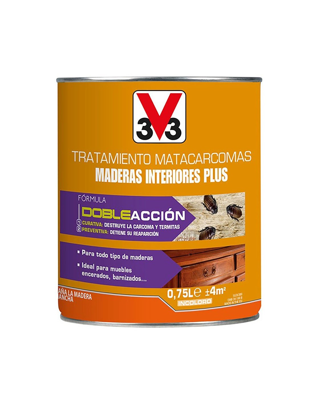 Tratamiento matacarcomas maderas interiores plus para uso en el interior del hogar en todo tipo de maderas. incoloro. aplicación con pincel. fórmula doble acción: tratamiento curativo que destruye la carcoma y termitas y tratamiento preventivo que detiene su reaparición. no mancha y es compatible con todos los acabados. rendimiento: 750 ml ±4 m², tiempo de secado entre capas: 1 h y completo: 48 h