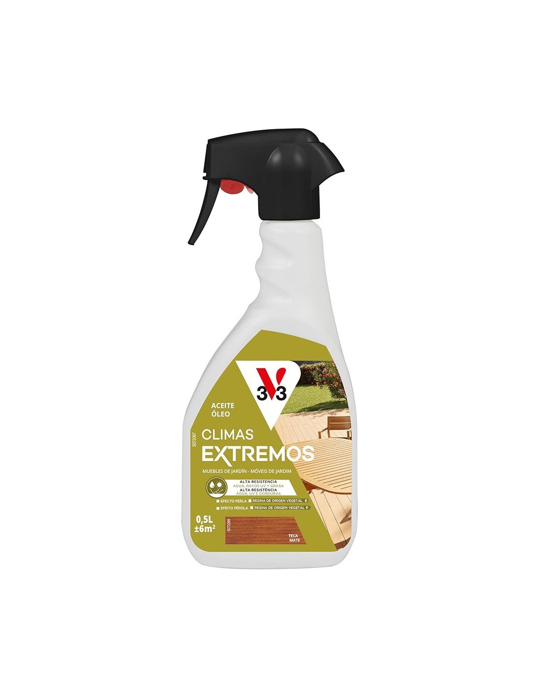 Aceite en pulverizador, climas extremos, color teca, para todo tipo de muebles de jardín. la fórmula contiene 88% de carbono de origen biológico sobre el carbono total. nutre la madera y la protege de ponerse grisácea. alta resistencia contra agua, rayos uv y grasa. efecto perla. aplicación: repartir el aceite con brocha y dejar secar 2 h para una segunda capa. rendimiento: 500 ml ±6 m²