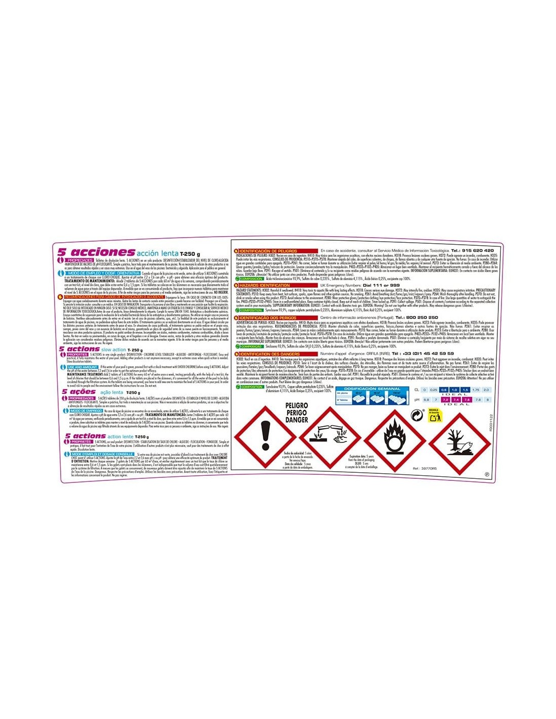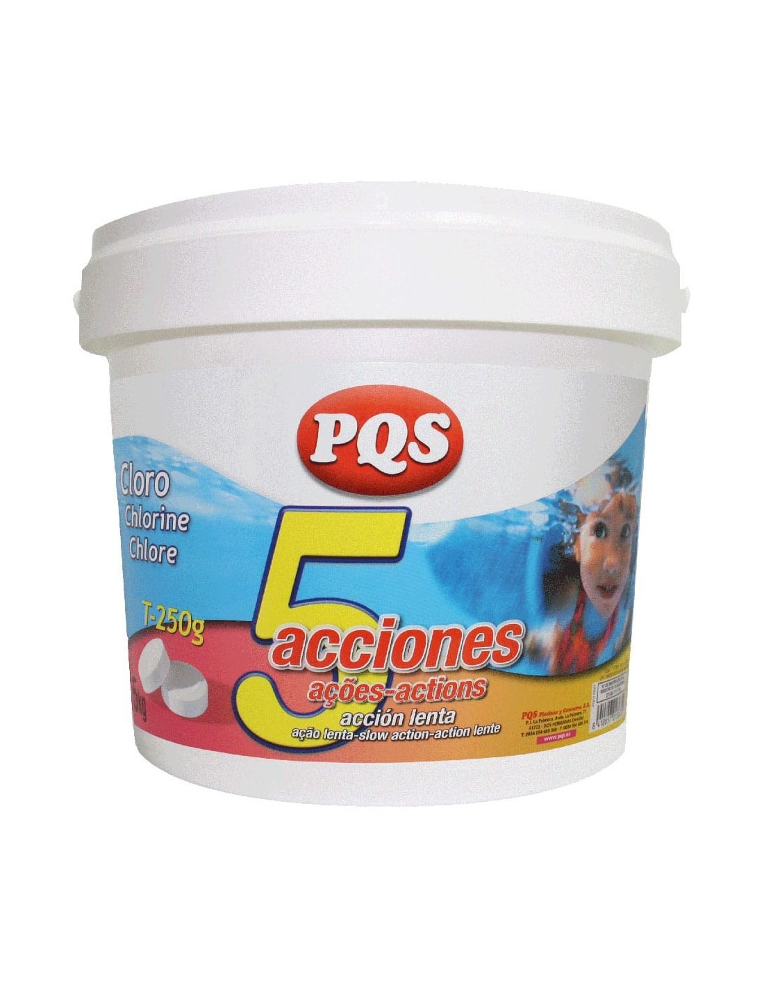 Cloro 5 acciones, tabletas de 250 g, bote 5 kg. de disolución lenta con 5 efectos: desinfectante, estabilizador de cloro, algicida, antihongos y floculante. dosis: añadir 2 tabletas a la semana en skimmer o clorador flotante por cada 60 m³ de agua