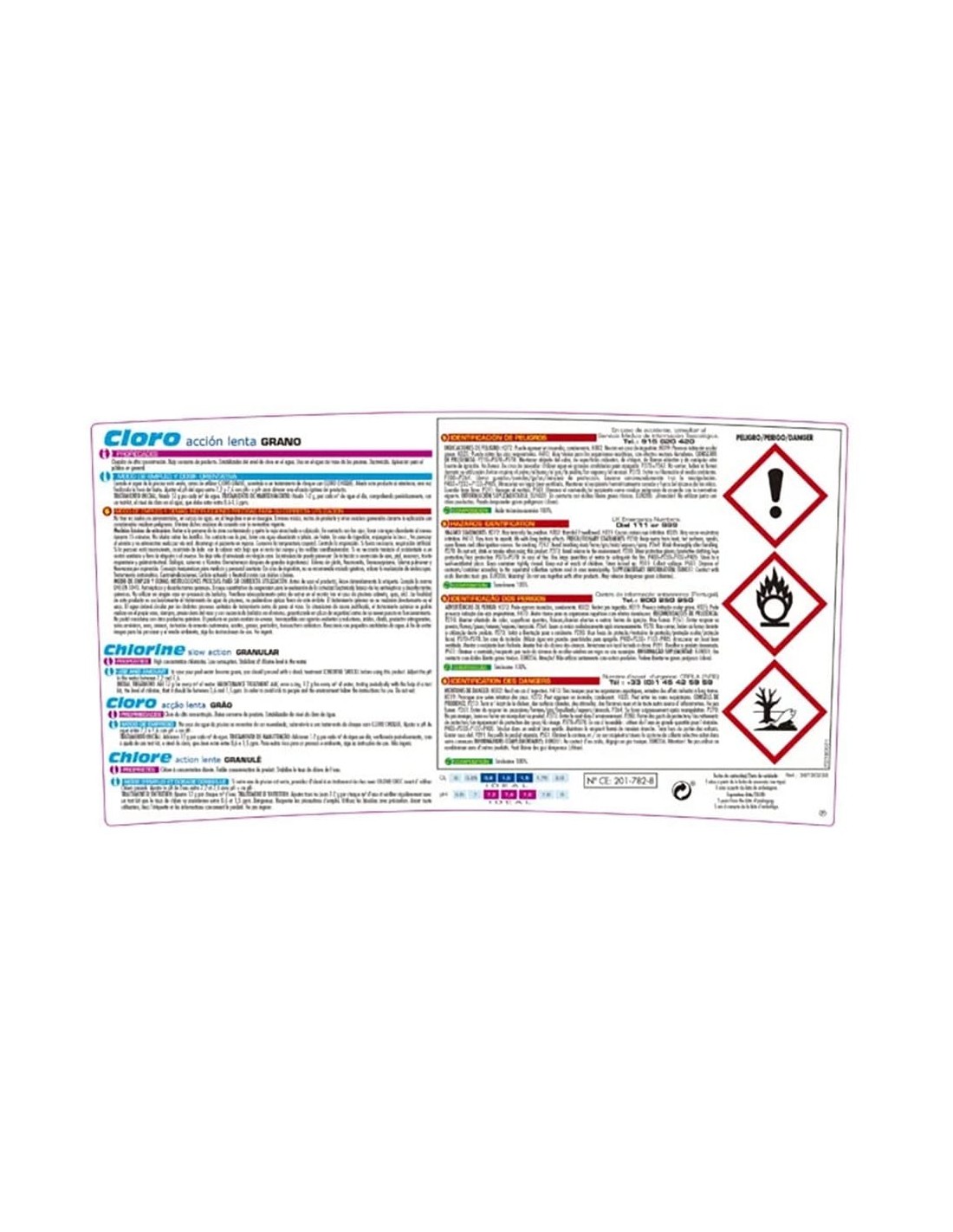 Cloro granulado, bote 5 kg. máxima concentración de materia activa. estabilizador de cloro, no modifica el ph. dosis: inicial: 12 g/m³. mantenimiento: 1-2 g por m³/día, comprobar nivel de cloro libre entre 0,6 y 1,5 ppm
