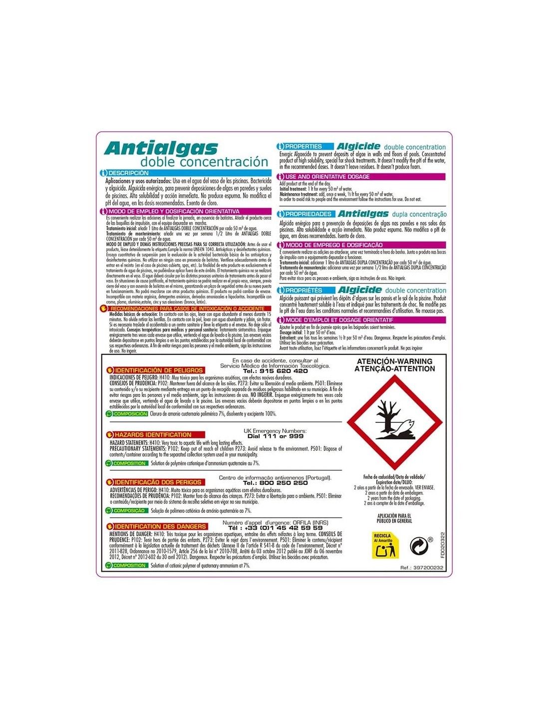 Antialgas enérgico especialmente diseñado para prevenir y eliminar incrustaciones de algas en paredes y suelos de piscinas, alta solubilidad y acción inmediata, no modifica el ph del agua, en las dosis recomendadas, no produce espuma, exento de cloro
