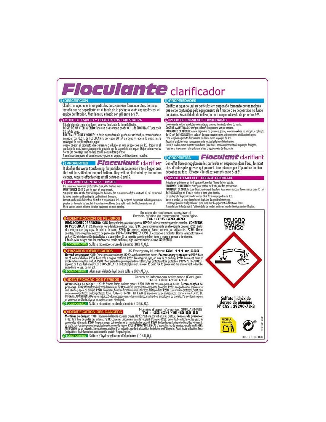 Floculante, garrafa 5 l. clarifica el agua al unir las partículas en suspensión formando otras de mayor tamaño que se depositarán en el fondo de la piscina o serán capturadas por el equipo de filtración mantiene su eficacia con ph entre 6 y 9