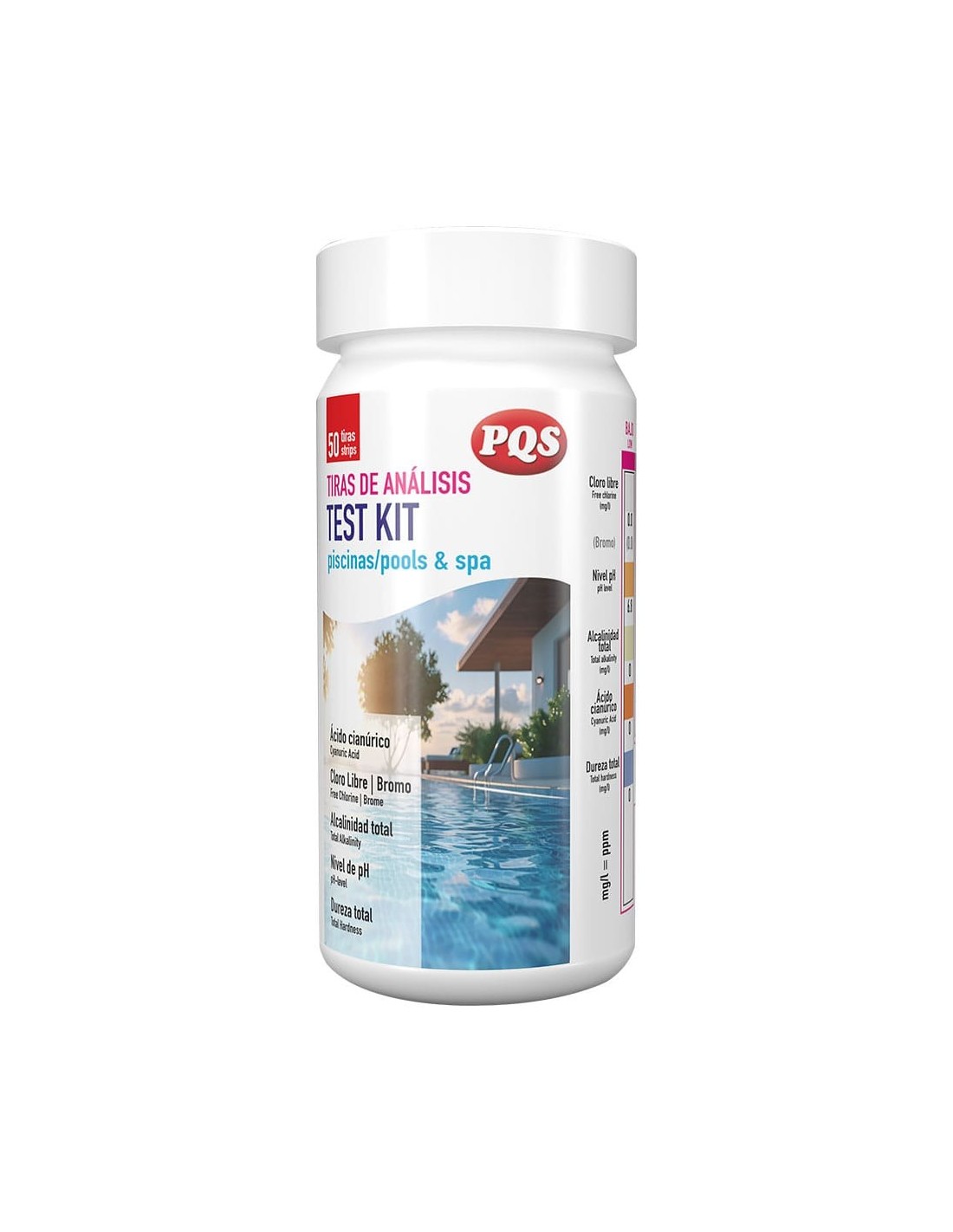 Test kit tiras 6 funciones, 50 uds. cada banda permite medir: ácido cianúrico, cloro libre, bromo, ph, alcalinidad total y dureza total