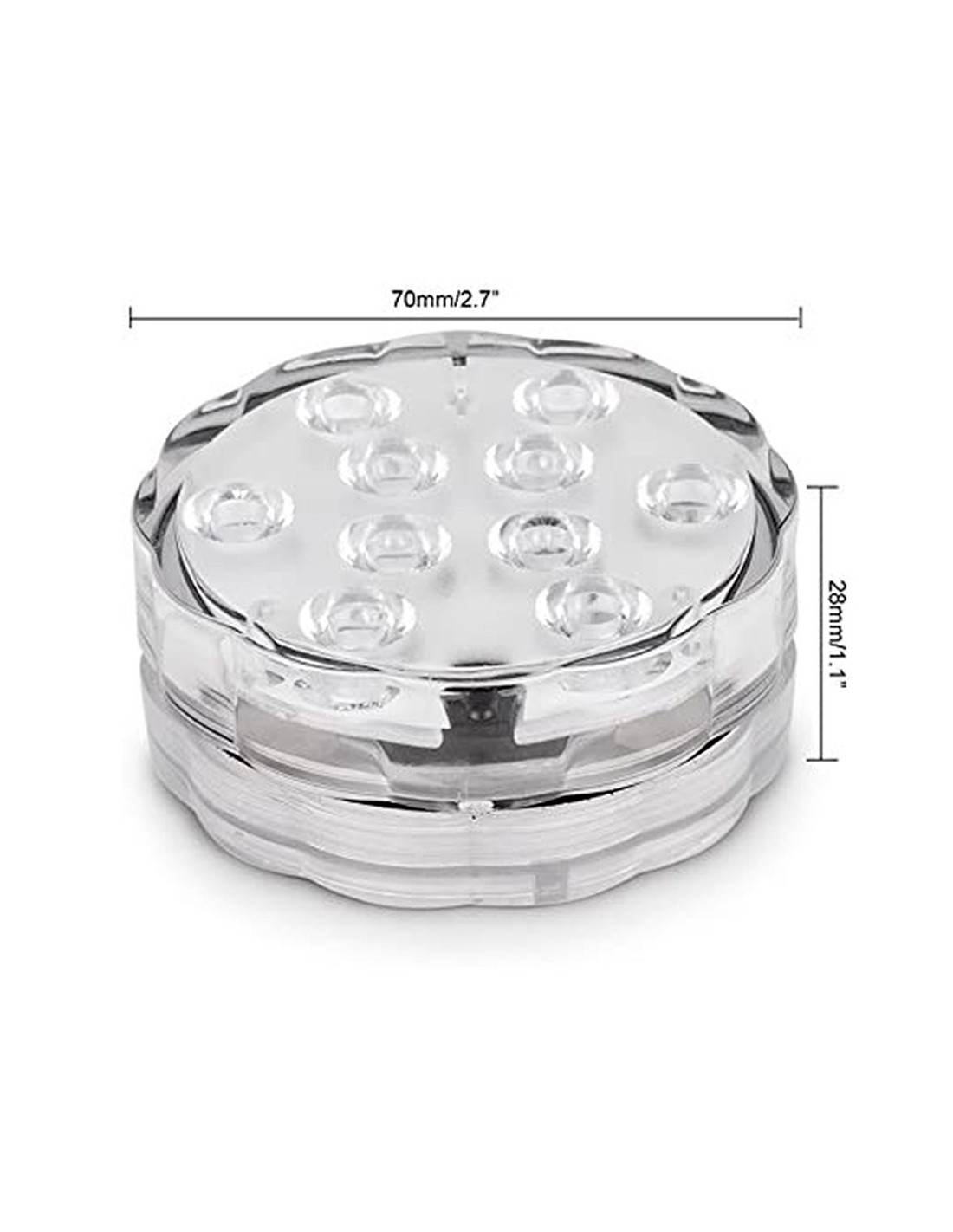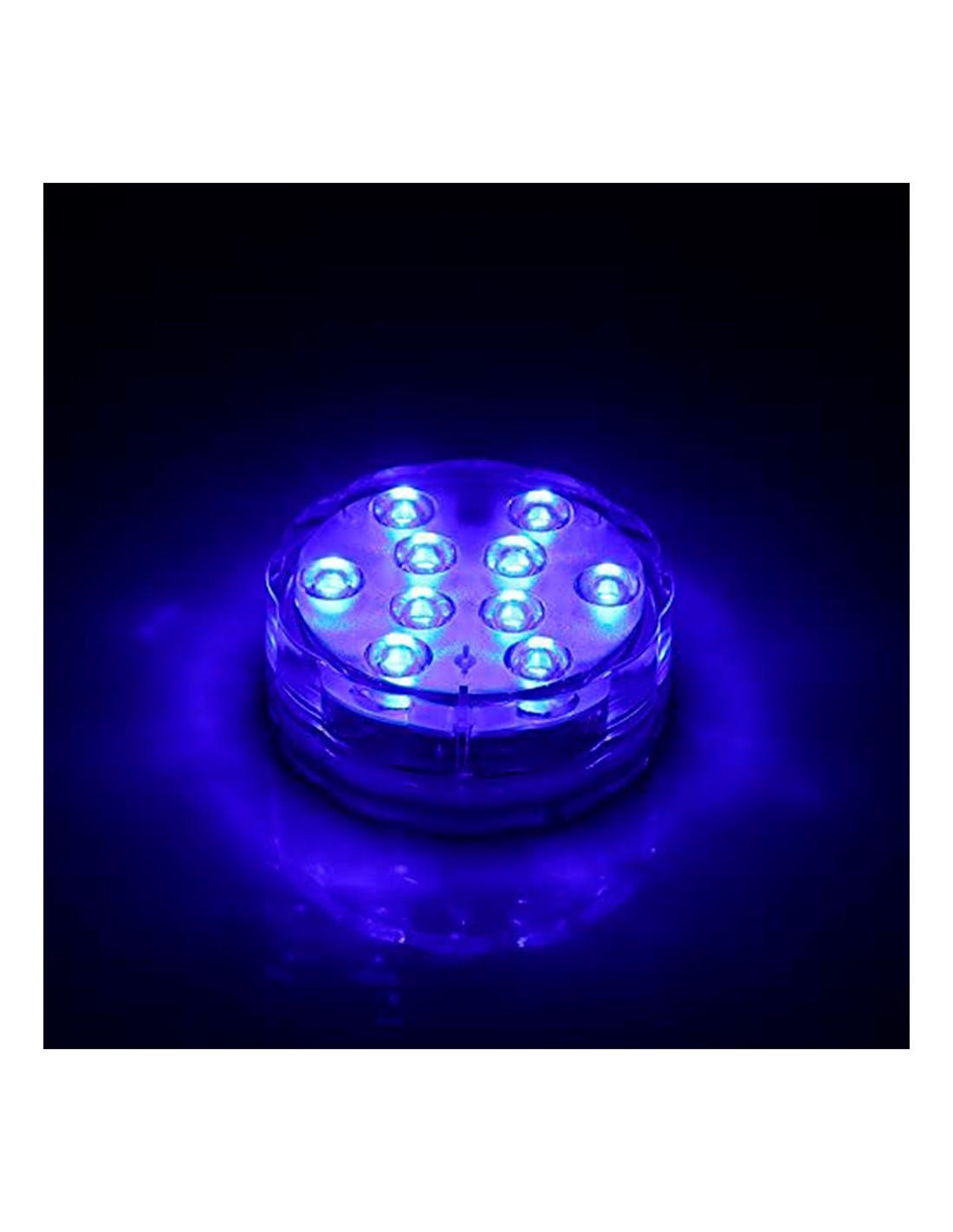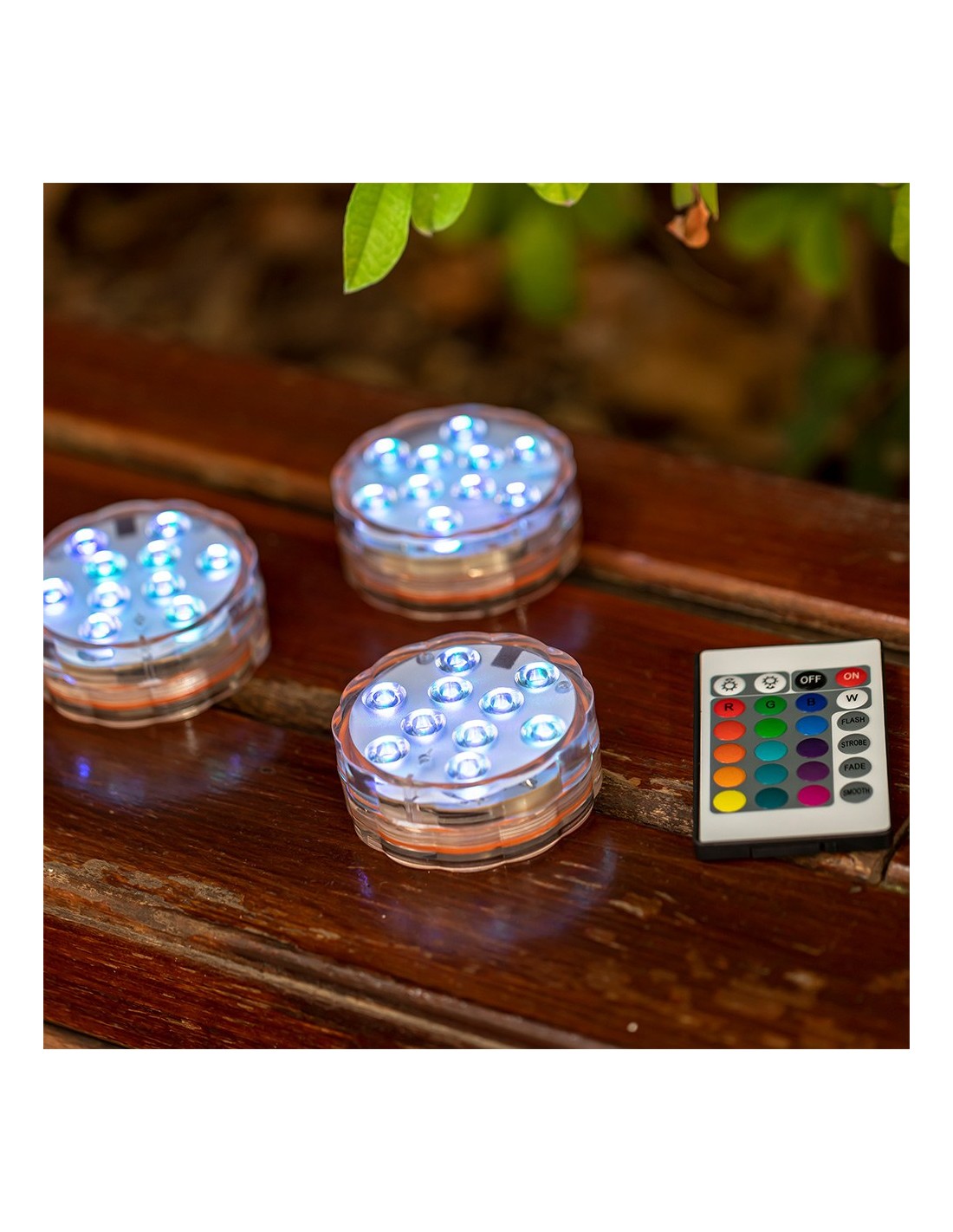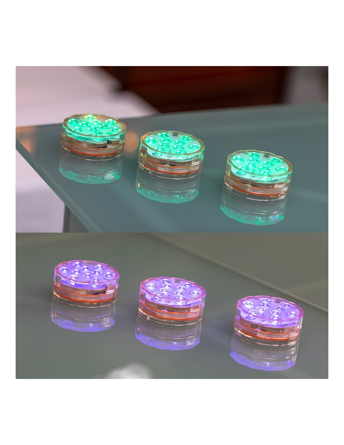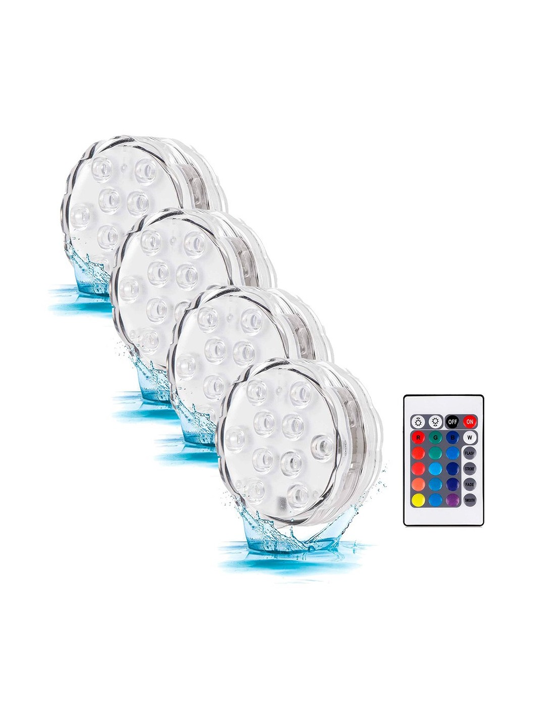 Luces led sumergibles para piscinas, estanques, bañeras o centros de mesa. diseño resistente al agua con protección ip68. disponen de una amplia variedad de colores rgb. incluye 2 mandos a distancia. funcionan con pilas aaa (no incluidas). ideales para decoración en jarrones, fuentes y arreglos florales. dimensiones: ø7 x 3 cm, 4 uds
