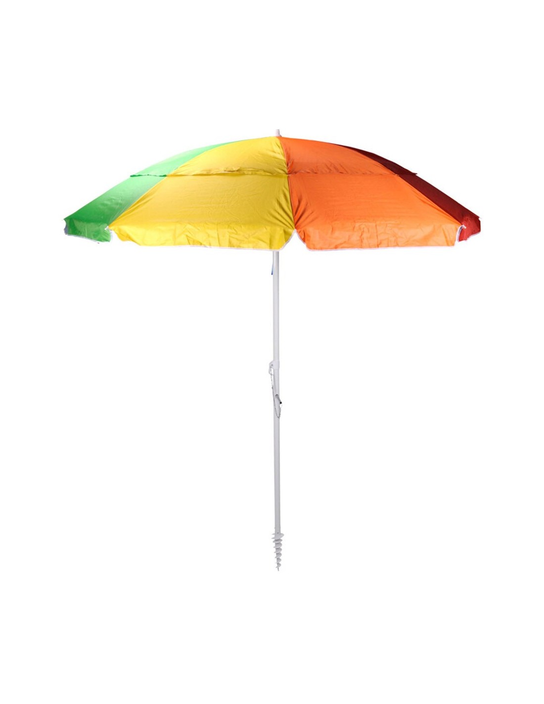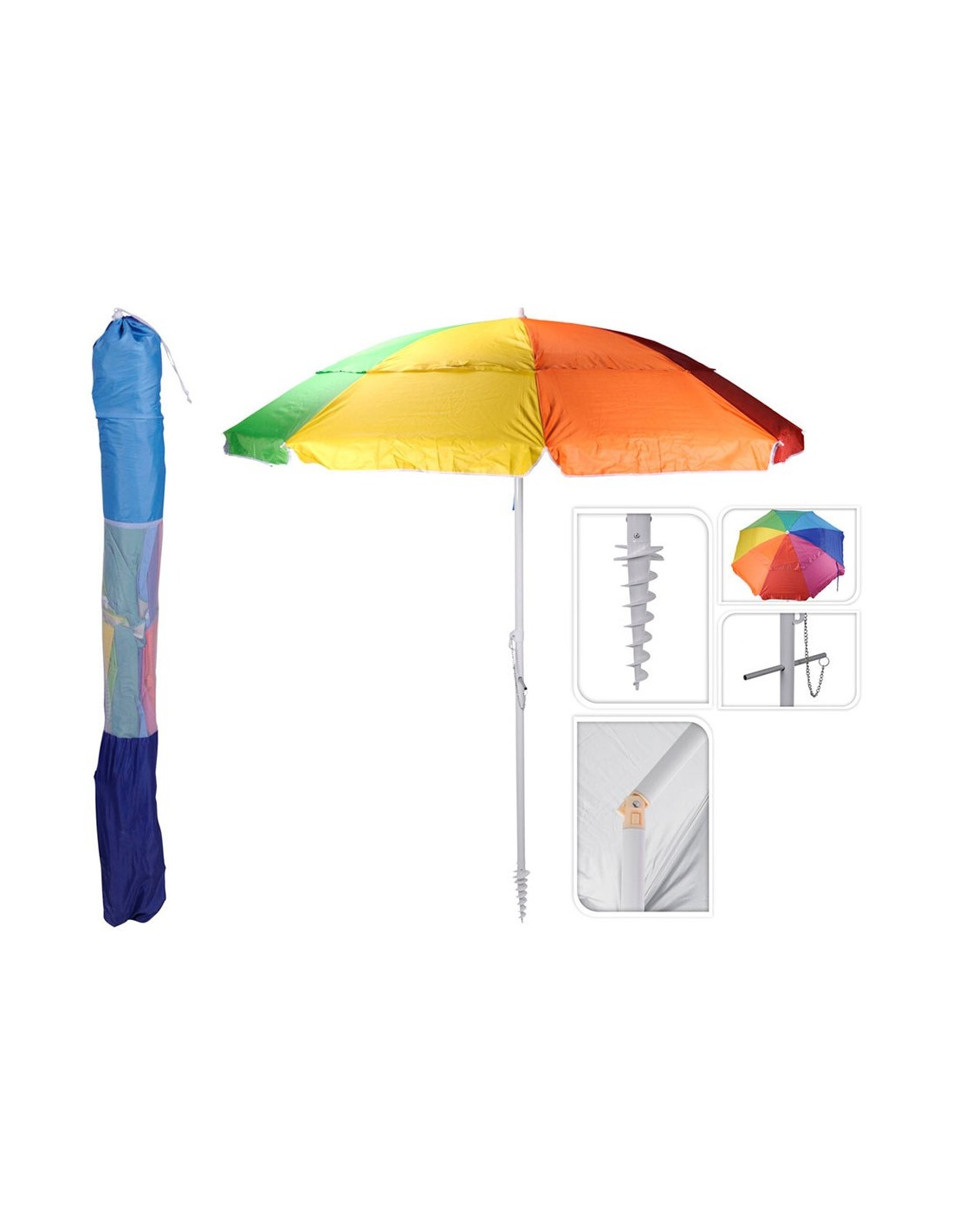 Sombrilla de playa arcoíris ø200 x 220 cm, 8 varillas ø3,5 mm, mástil ø32/32 mm con espesor 0,65 mm y sistema de tornillo de arena de pp con barra de aluminio. estructura totalmente metálica en color blanco con sistema de inclinación de pp. tejido de poliéster 170t con paravientos, recubrimiento interior de aluminio, upf 50+. incluye bolsa de transporte de nylon con ventana de malla