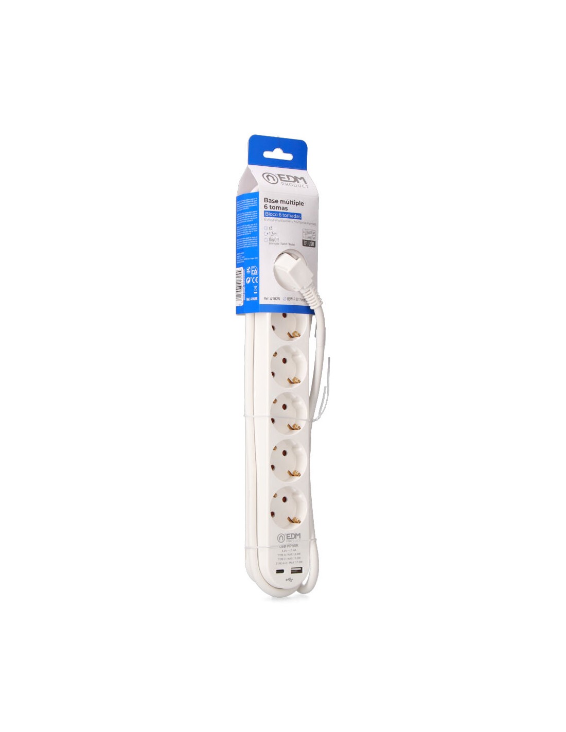 Prolongador con 6 tomas 2 p+t schuko, con interruptor, 2 usb: a (5,0 v dc 2,4 a total 12,0 w) + c (5,0 v dc 3,0 a total 15,0 w), 16 a 250 v, cable h05vv-f, 3g1,5mm² de 1,5 m, 3680 w/230 v máximo, blanco, dispone de ranuras específicas para el montaje en pared y la sujeción con bridas, dimensiones 360 x 46 x 41 mm