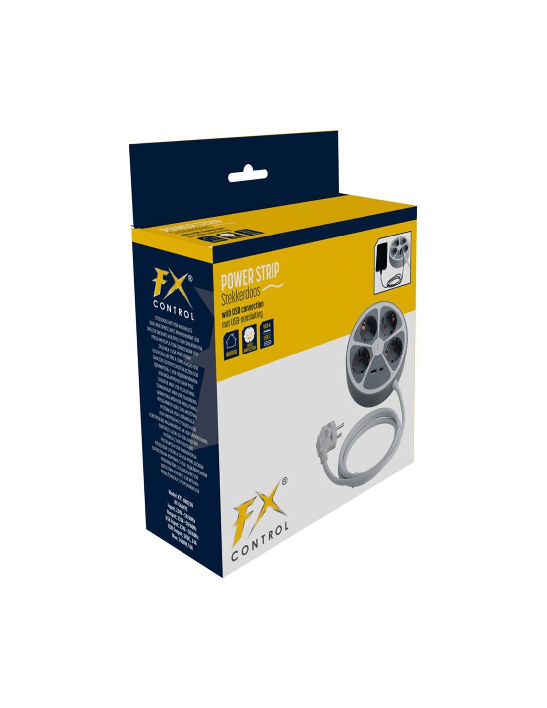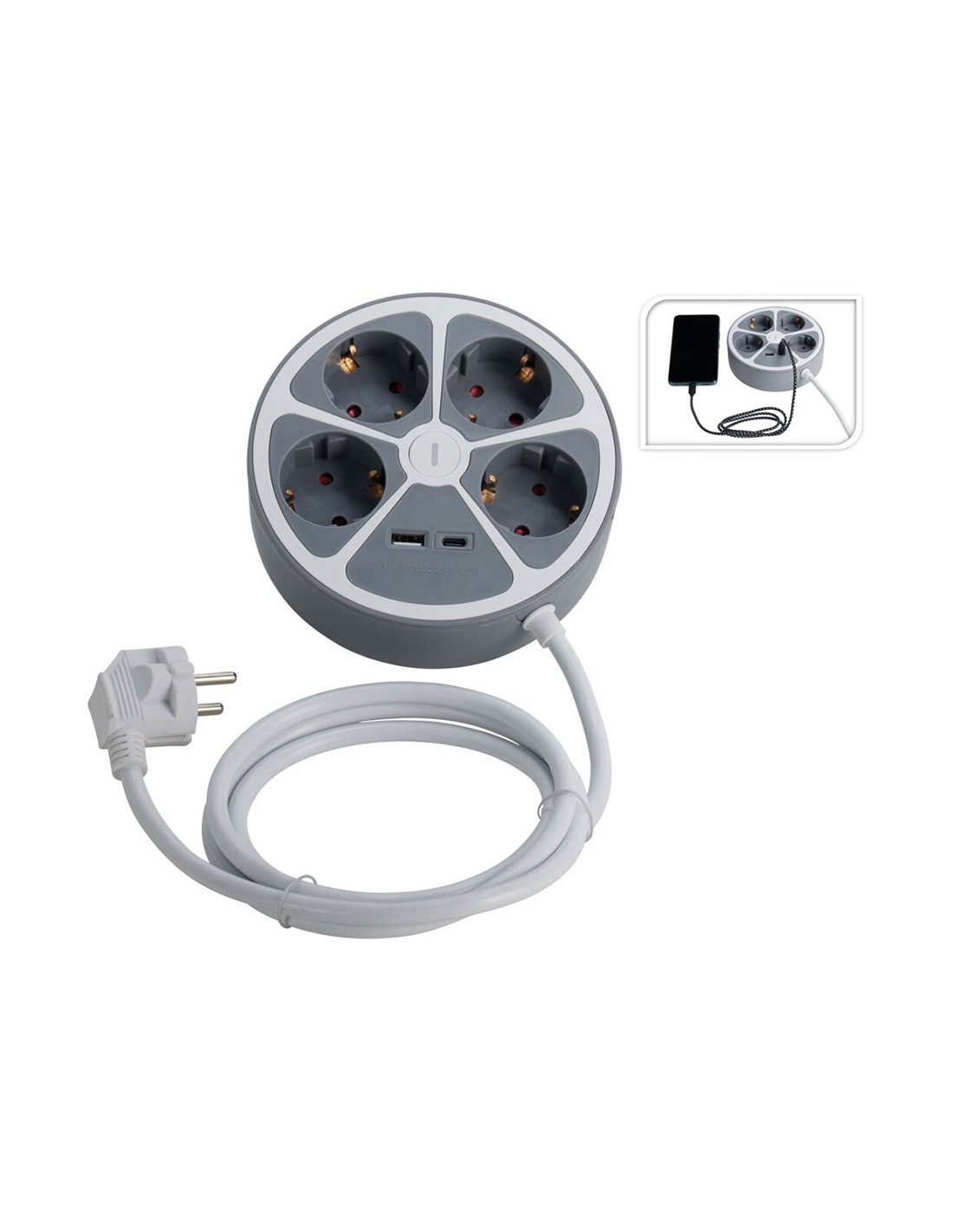 Base de enchufe múltiple redonda. incluye 4 tomas 2p+t, usb-a y usb-c, grado protección ip20, protección para niños, cable 1,4 m, 220 - 240 v~50hz, máximo 3680 w, blanca y gris