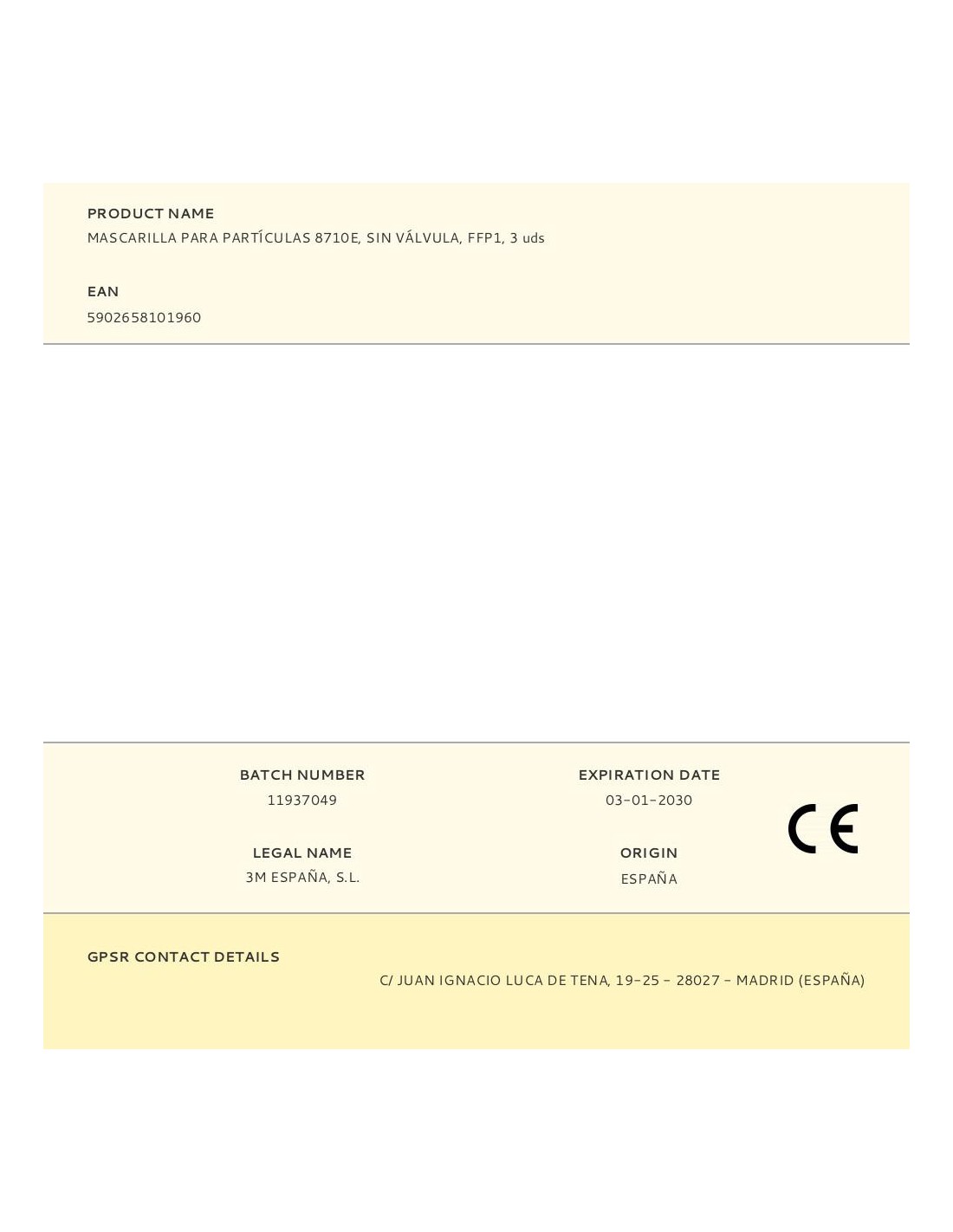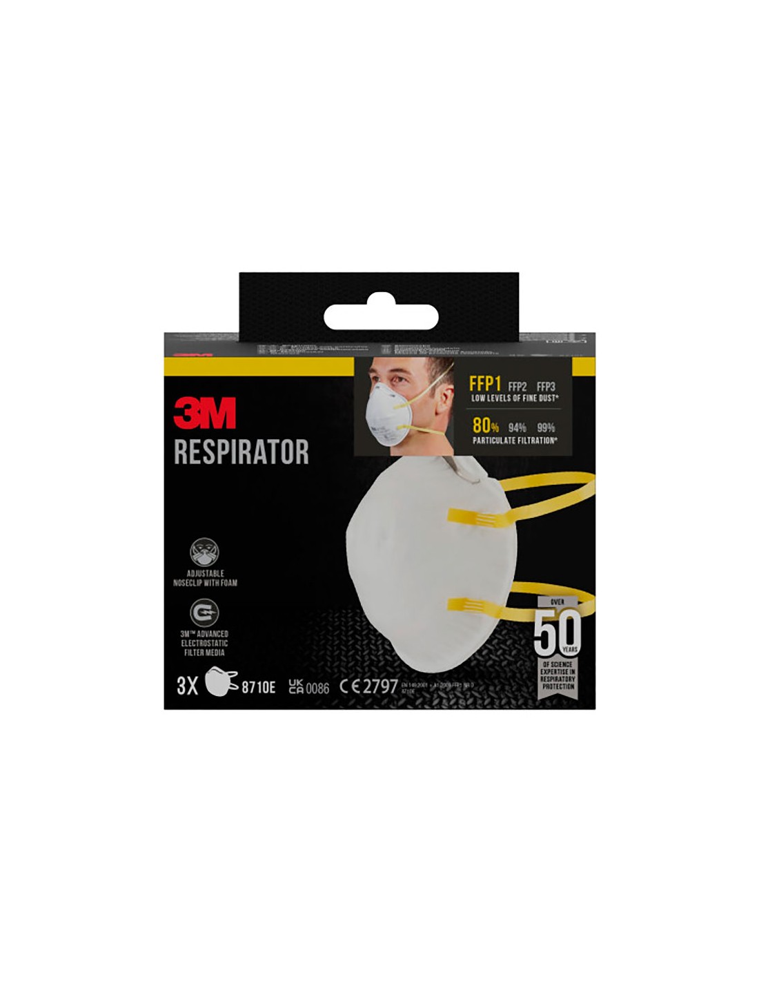 Mascarilla para partículas 8710e con una carcasa robusta resistente a la deformación, clip nasal ajustable, para protección respiratoria. con clasificación ffp1 con filtración del 80 % para partículas, 3 uds