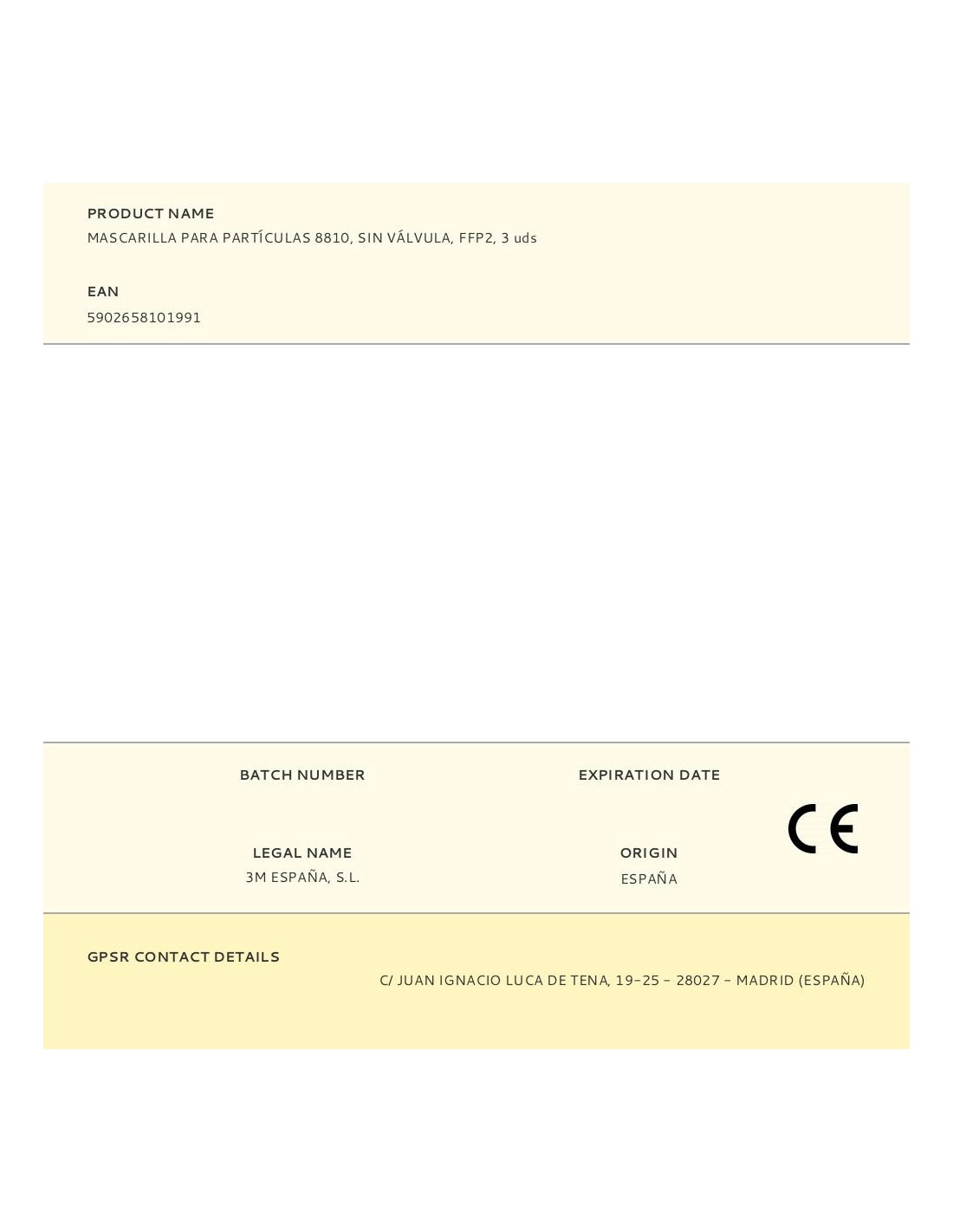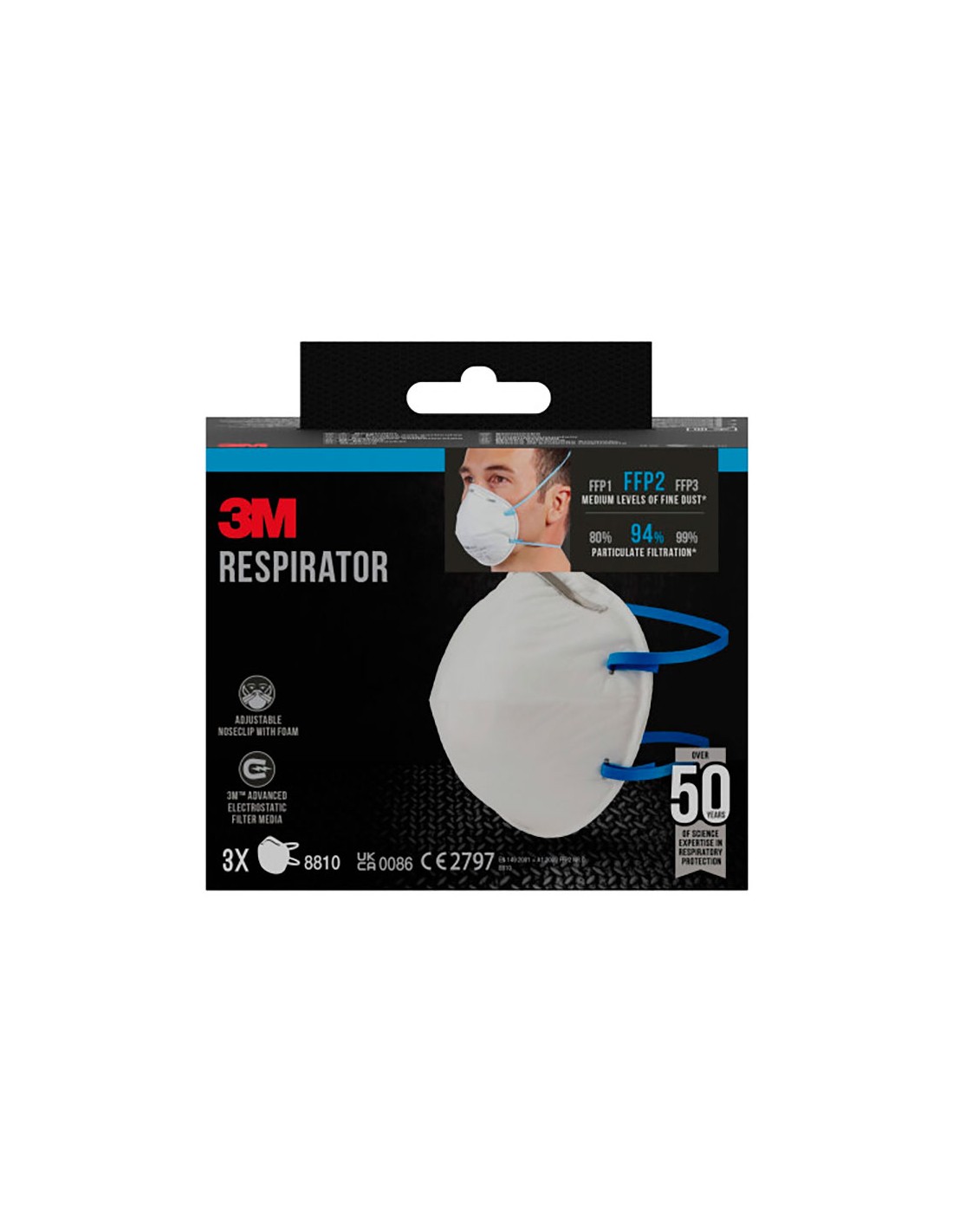 Mascarilla para partículas 8810 con una carcasa interior duradera y resistente al colapso, clip nasal ajustable con espuma, para protección respiratoria. con clasificación ffp2 con filtración del 94 % para partículas, 3 uds