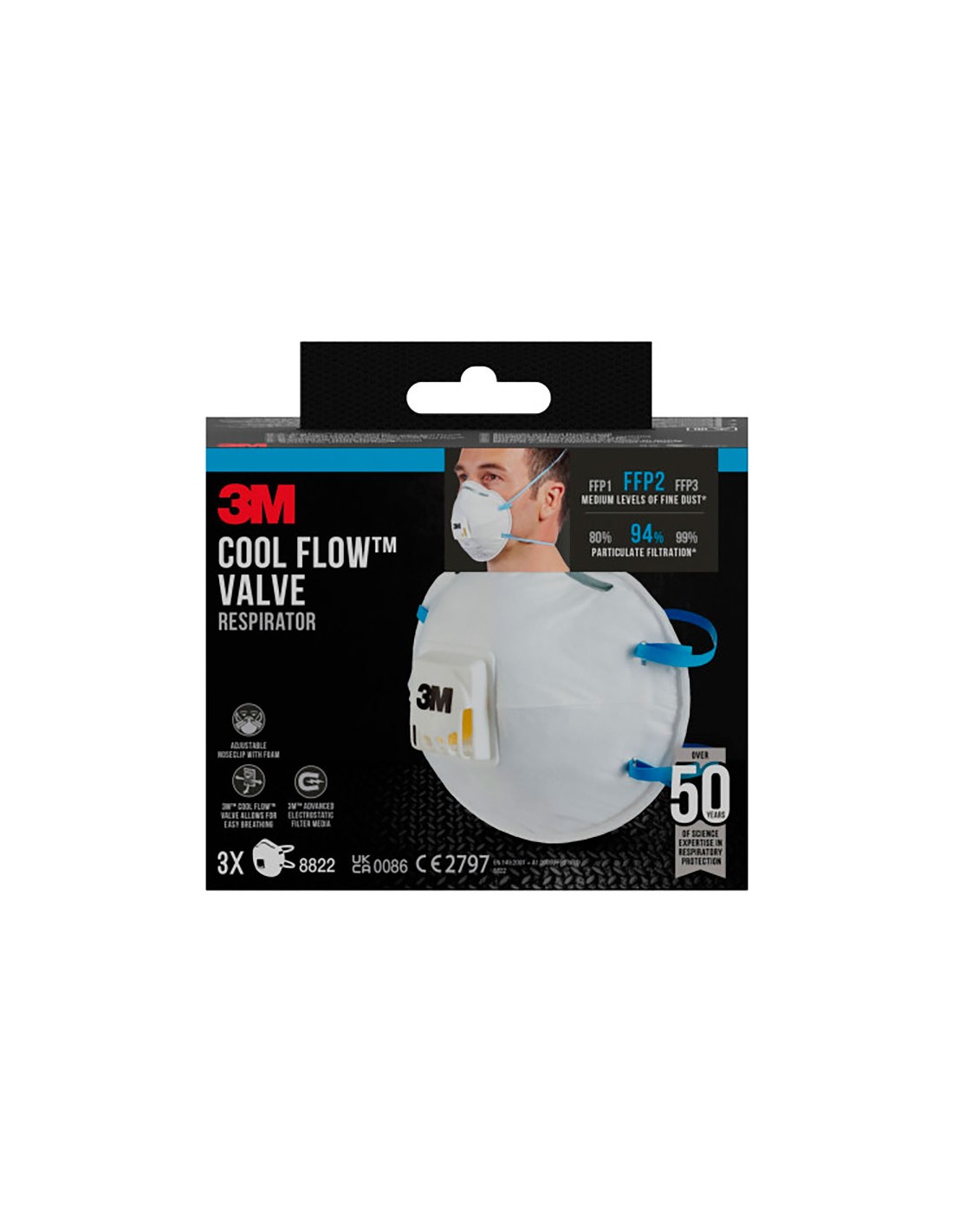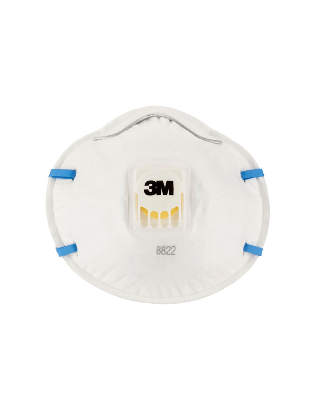 Mascarilla para partículas 8822, ffp2, con válvula, carcasa robusta y resistente al colapso que se adapta fácilmente a la mayoría de formas y tamaños de rostro. el clip nasal ajustable ayuda a formar un sello en la nariz y las mejillas. para lijado manual y herramientas eléctricas. contiene 3 uds