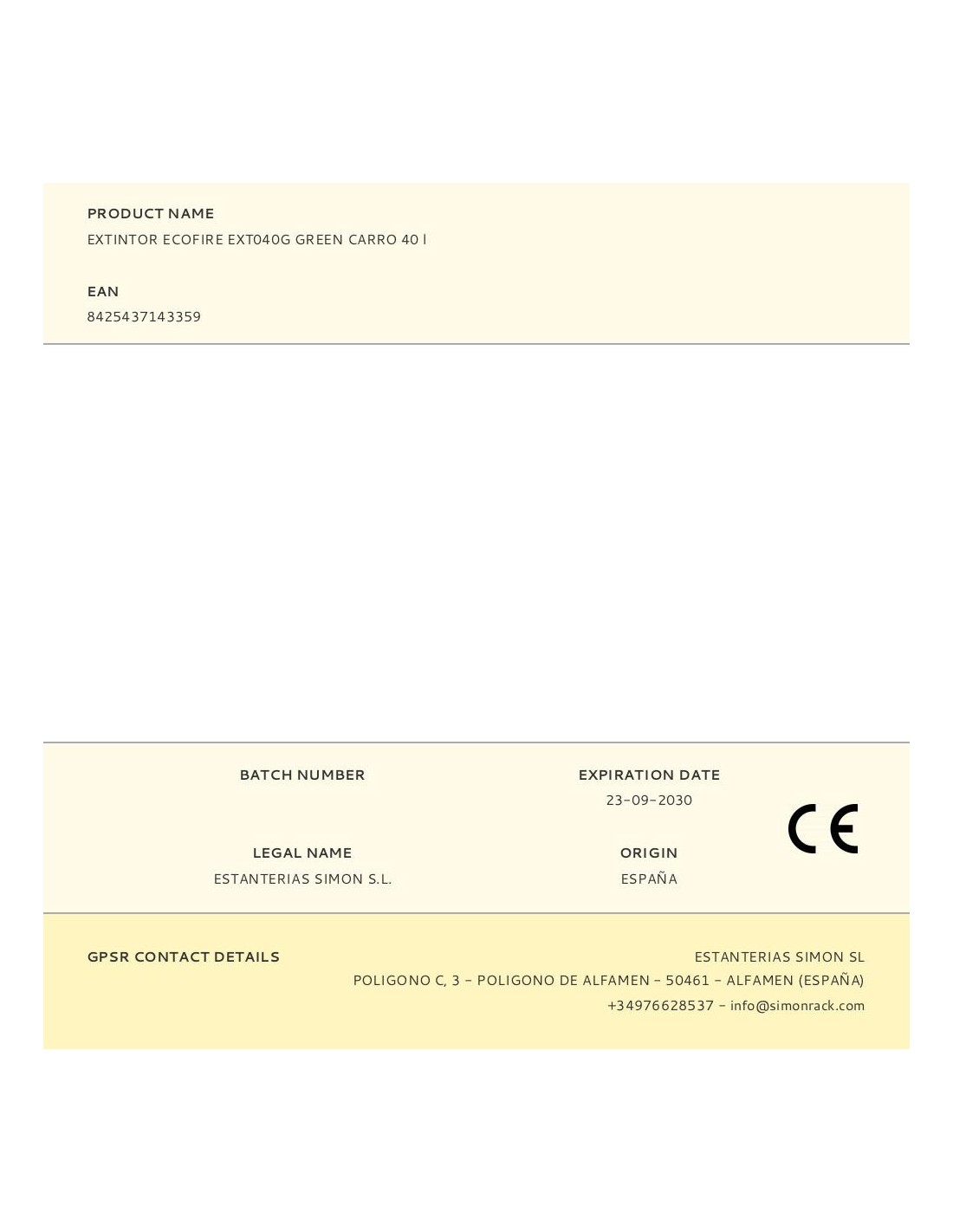 Equipo de protección contra incendios de 40 l, dimensiones 1130 x 560 x 450 mm, con ruedas para facilitar su transporte, actúa como bloqueante del fuego, encapsula el humo y evita emisión de gases tóxicos, previene transmisión de calor, propagación del incendio y reignición, eficaz en extinción de baterías de litio por inmersión y fuegos de grasas, aceites y metales (tipo d), 100% ecológico: no tóxico, no bioacumulable, no corrosivo y biodegradable, alcance de disparo de 20 metros (15 m + 5 m de manguera) para proyección segura, ideal para puntos de carga de coches eléctricos, transporte y almacenaje de dispositivos electrónicos, recargable aunque la descarga haya sido parcial, presión de servicio 20 °c: 17,5 bar, temperatura de servicio de -30°c a 60°c