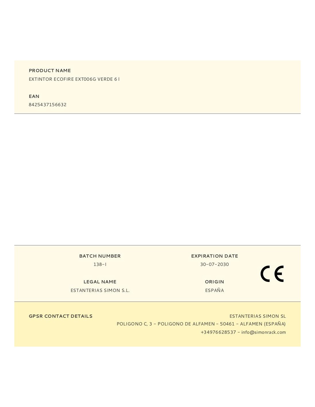 Equipo de protección contra incendios 6 l ecofire fighting ecológico, biodegradable, orgánico y no tóxico. encapsula el humo al instante, no daña a las personas, animales ni plantas y convierte de forma permanente en ignífugo todo lo que recubre. bloquea el fuego por completo: impide la reactivación del incendio una vez extinguido. su acción comienza al alcanzar los 90-95°c incluye soporte metálico para la pared. no transmite calor. se limpia con agua y no deja residuos. temperatura de servicio: desde -30°c. presión de servicio a 20°c: 17,5 bar. ensayo certificado dieléctrico hasta 25.000 v. para: coches eléctricos, patinetes, cocinas, enchufes y espacios de difícil evacuación
