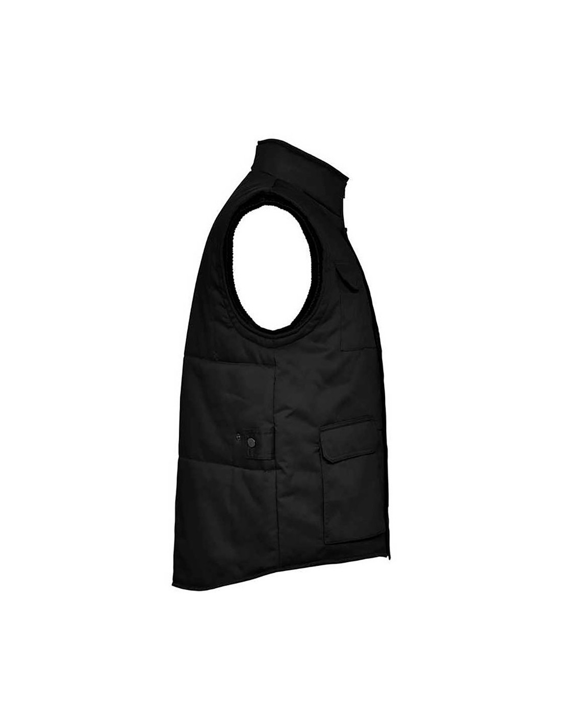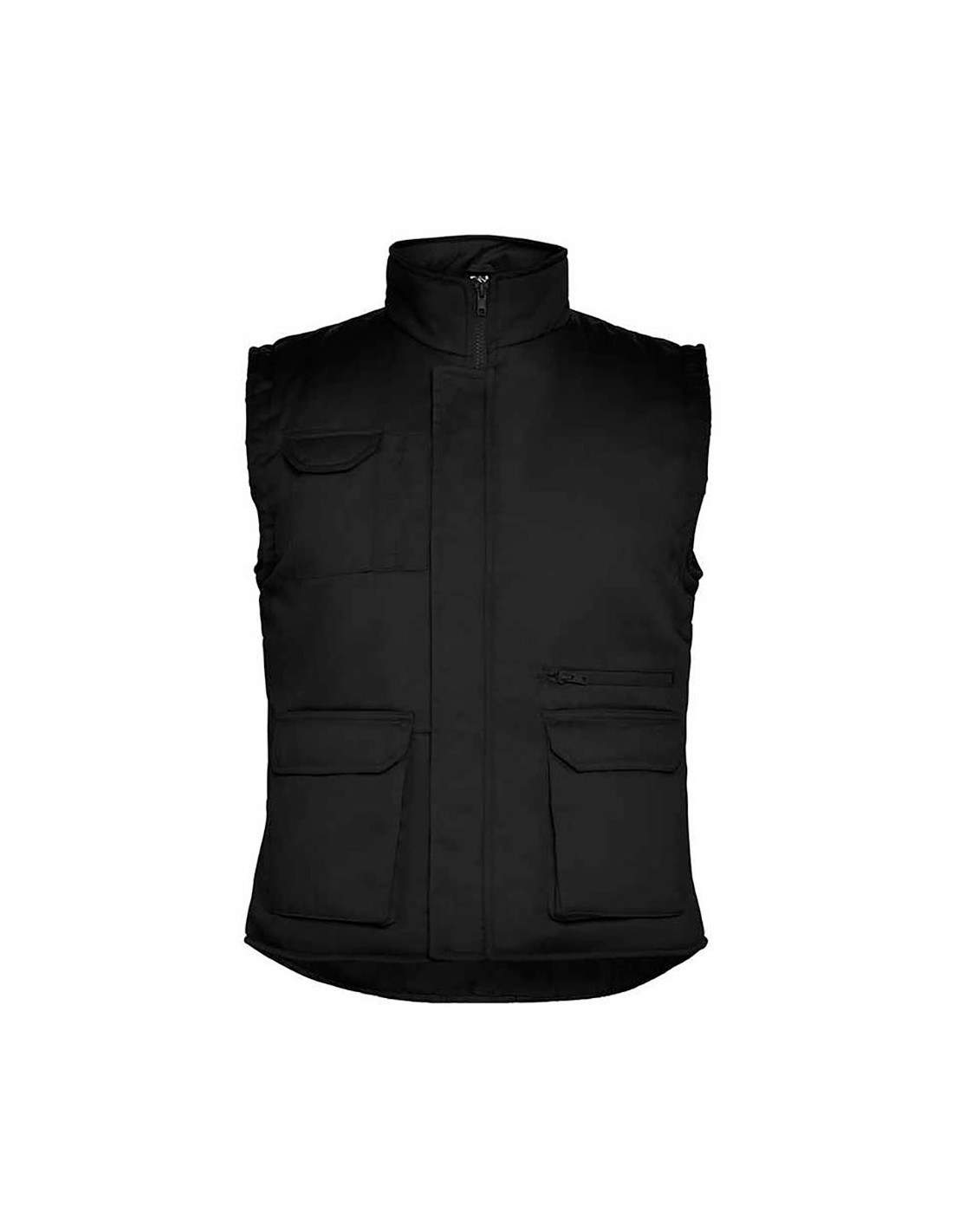 Chaleco laboral almanzor negro t-s, 55 x 64-70 cm, multi bolsillo exterior: 80% poliéster 20% algodón, 200 g/m² interior: 100% poliéster acolchado 170 g/m² cremallera central con trabilla y velcro, bolsillo exterior para móvil lado derecho dos bolsillos frontales con fuelle y aberturas laterales, dos depósitos para bolígrafos, bolsillo con cremallera, bolsillo interior con velcro, cortavientos en las bocamangas, bajo posterior con faldón, tapetas ajustables en laterales con botones a presión