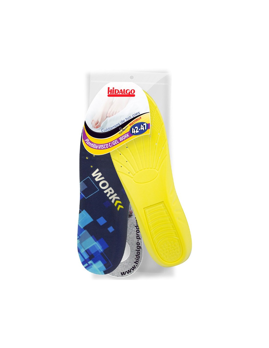 Plantillas work ideales para las largas jornadas laborales. absorben el cansancio que sufren los pies, incorporan una almohadilla de gel que amortigua la presión en el talón que ayuda a reducir el cansancio producido por posturas estáticas, adecuado para fascitis plantar, recubierta de un tejido transpirable que absorbe el sudor, aportando máximo confort, plantilla recortable y adaptable a tallas entre 42 y 47