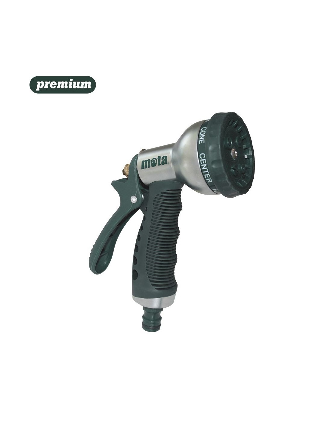Pistola de riego metalica ar22 con conector. multifuncion con boquilla ½ pulg. para riego o limpieza. cuerpo metalico y plastico abs de alta resistencia con empuñadura en goma termoplastica. gatillo plastico con bloqueo. 7 tipos de chorros: central, conico, suave, bruma, plano, jet y lluvia. se recomienda el uso de conector rapido de manguera con bloqueo mota (ar31). presentacion en blister