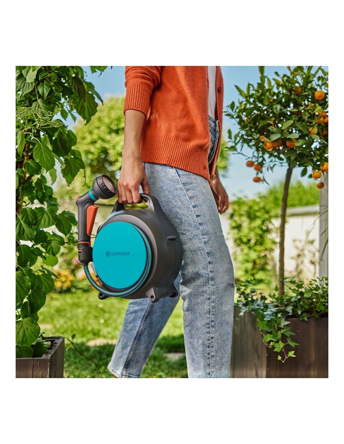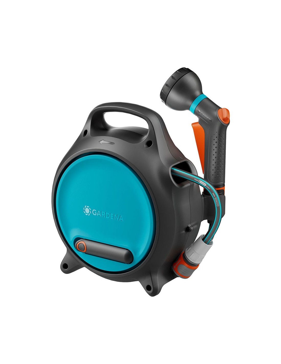 Enrollador de manguera portátil move 10 m, compacto y ligero. con manivela grande y plegable para el enrollado de la manguera. incluye rociador clásico, conector a grifo con adaptador y soporte. manguera de conexión de 10 m y manguera de alimentación de 1,5 m