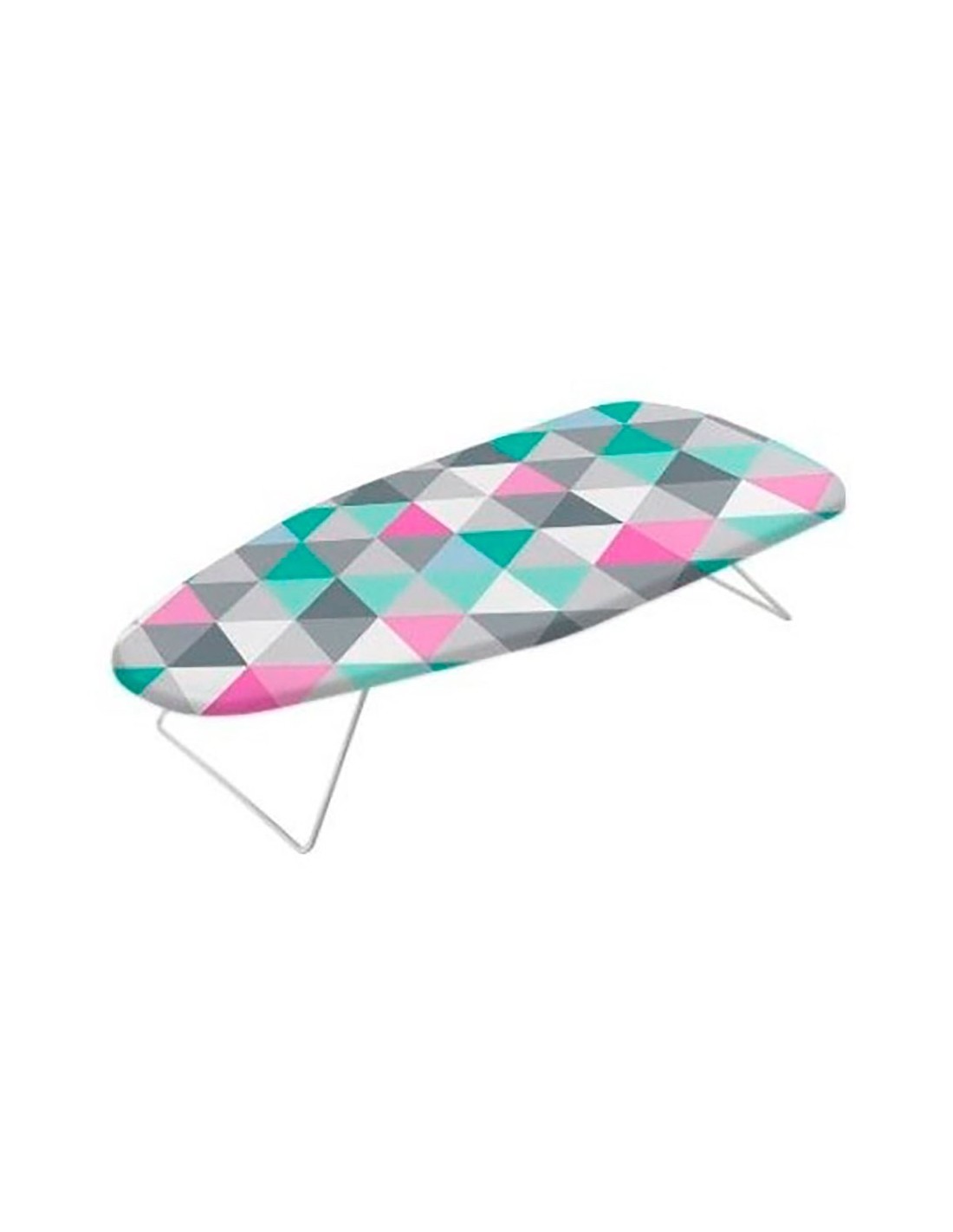 Tabla de planchar de sobremesa, alcor, modelo triángulo. cuerpo y pies de acero recubiertos de epoxi color blanco. funda de algodón y espuma de 8 mm de espesor. con lámina de acero perforada, nido de abeja, que facilita la circulación del aire y evita la condensación. incluye gancho para colgar. dimensiones: 34 x 75 cm