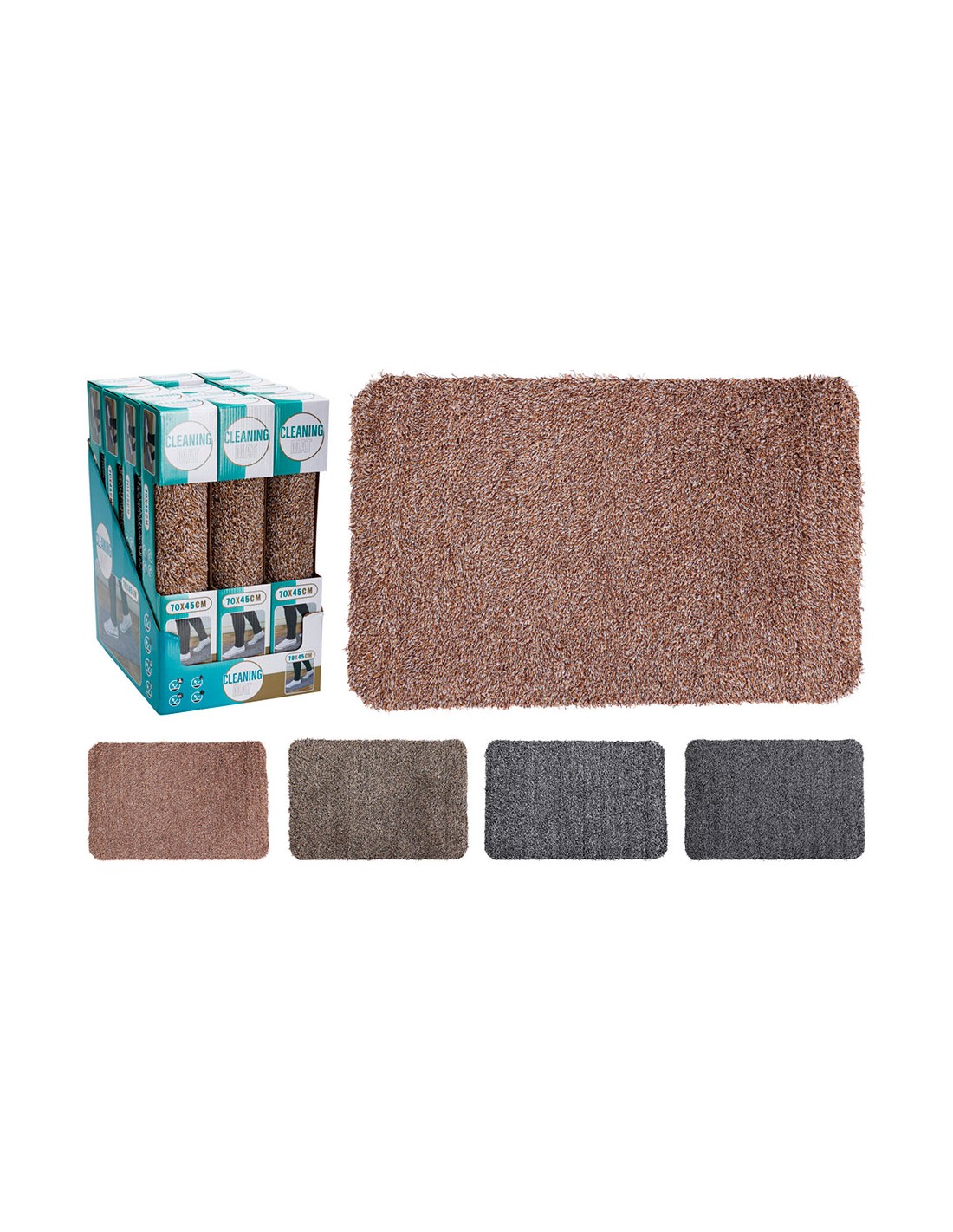 Felpudo cleaning mat 70 x 45 cm, colores surtidos. fabricado en poliéster y algodón. funciones: retiene la suciedad y el agua, mantiene los suelos limpios y secos, revestimiento antideslizante. presentado en expositor de 12 uds