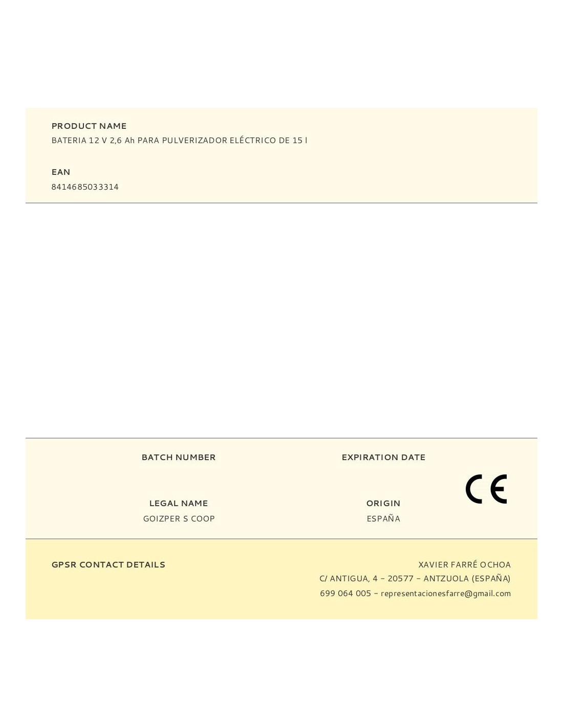 Bateria 12 v 2,6 ah para pulverizador eléctrico de 15 l