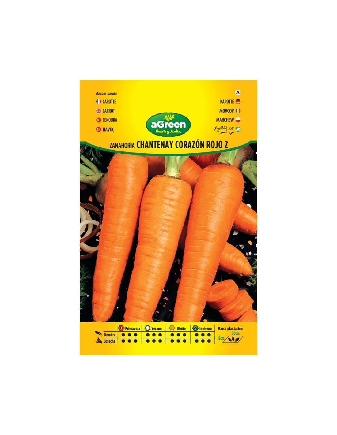Sobre con semillas de zanahoria chantenay corazón rojo 2 variedad media larga de raíz cónica, punta ligeramente redondeada, muy azucarada y gustosa siembra todo el año cosecha a partir de 3/4 meses
