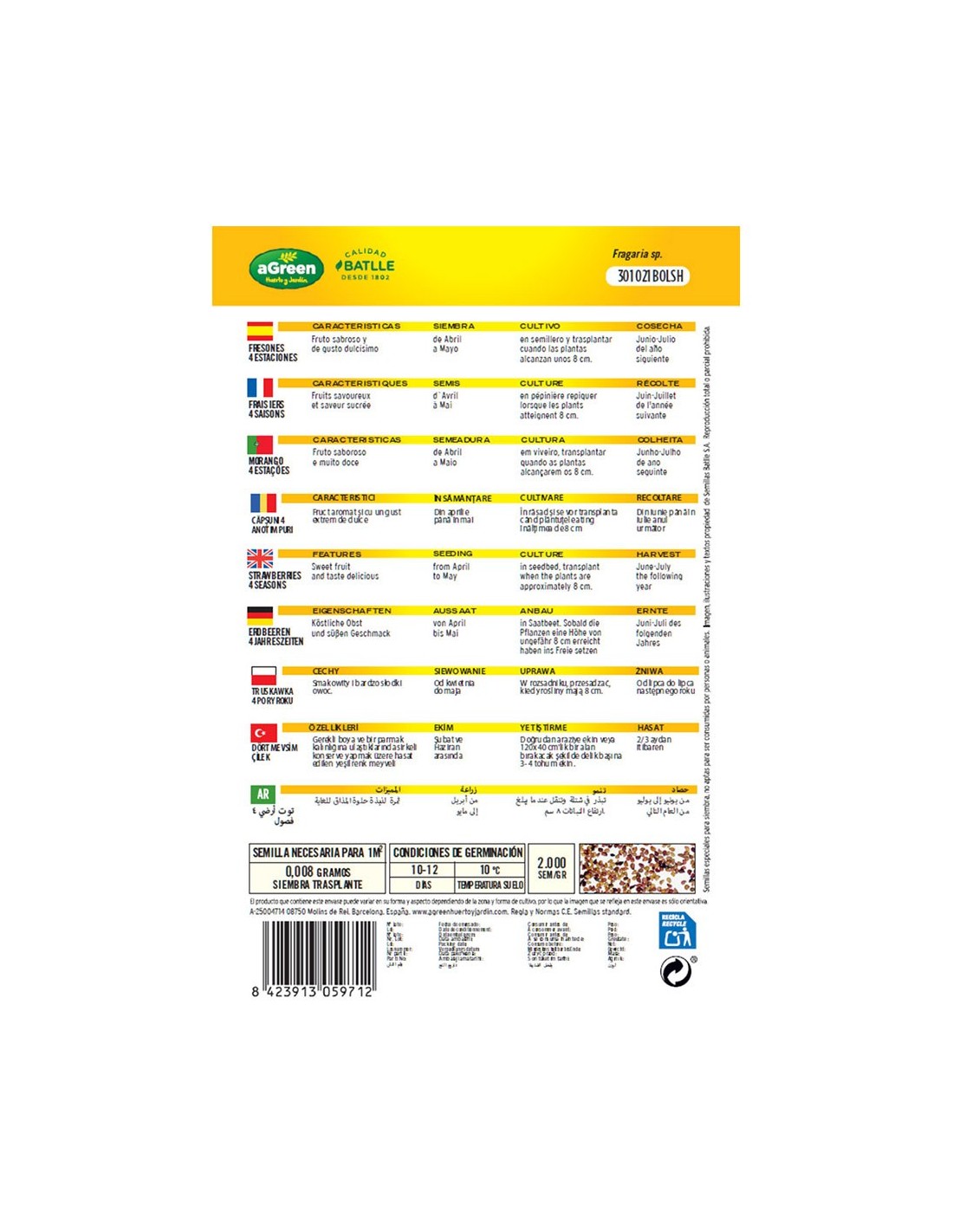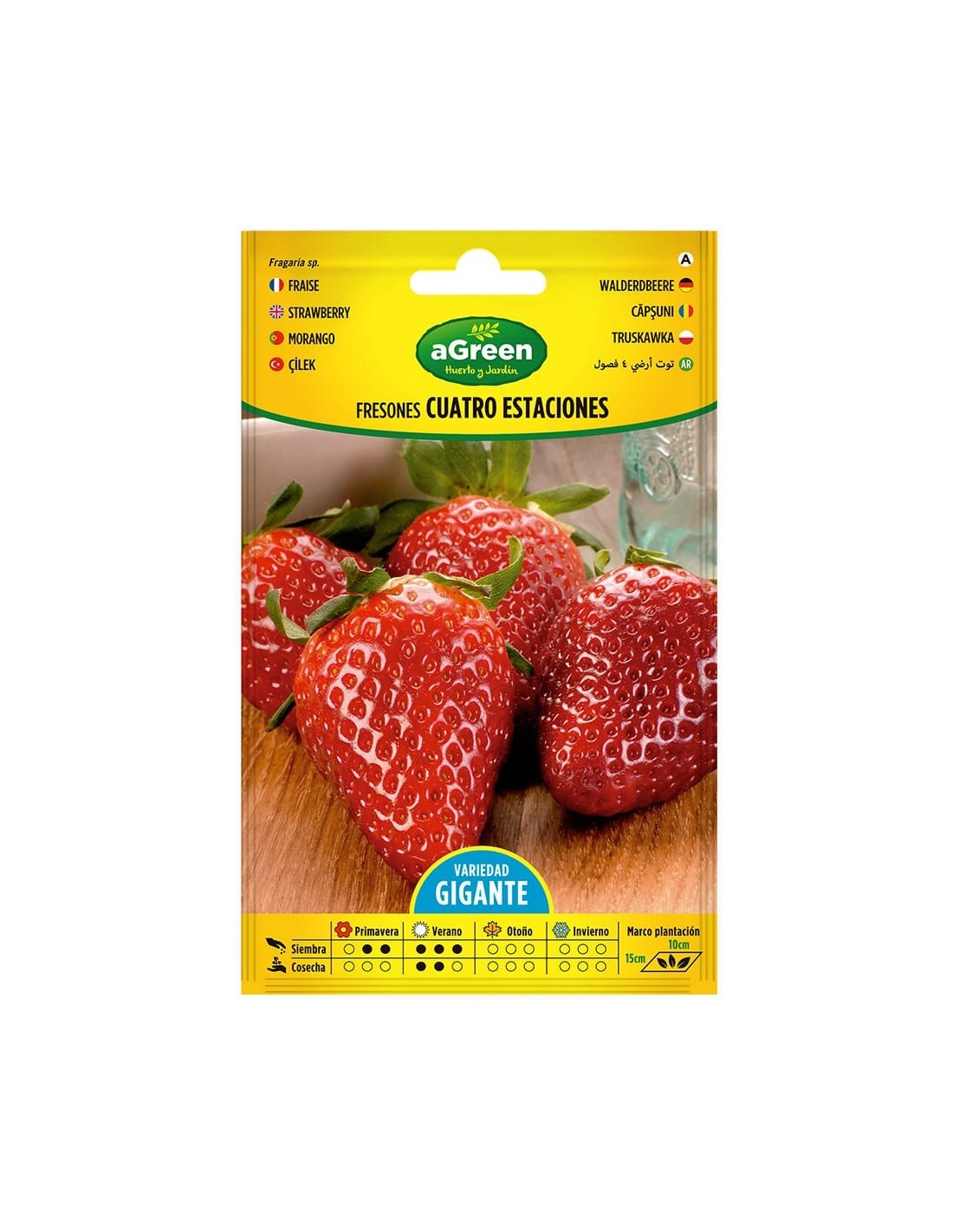 Sobre con semillas de fresones 4 estaciones fruto sabroso y gusto dulcísimo siembra de abril a mayo cosecha junio y julio del año siguiente