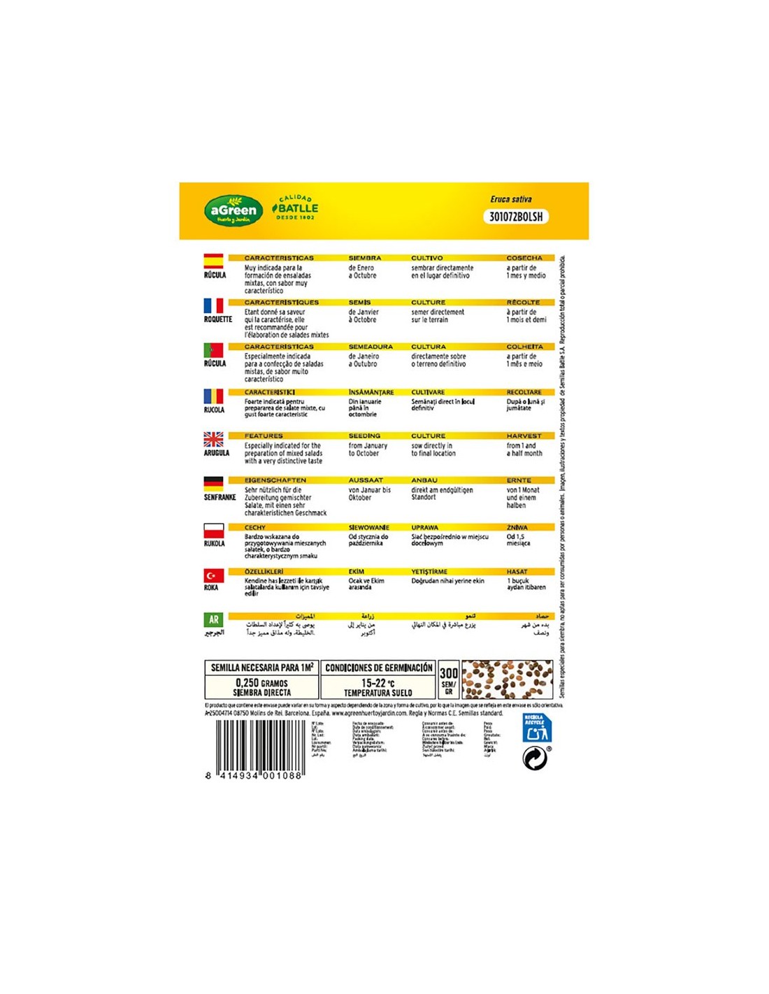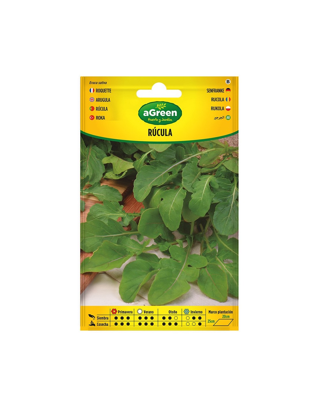 Sobre con semillas de rúcula muy indicada para la formación de ensaladas mixtas, con sabor muy característico siembra de enero a octubre cosecha a partir de 1 mes y medio