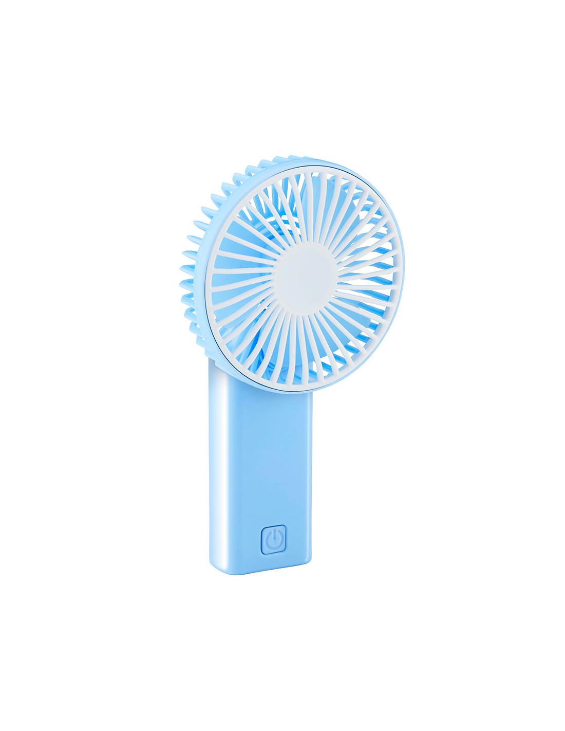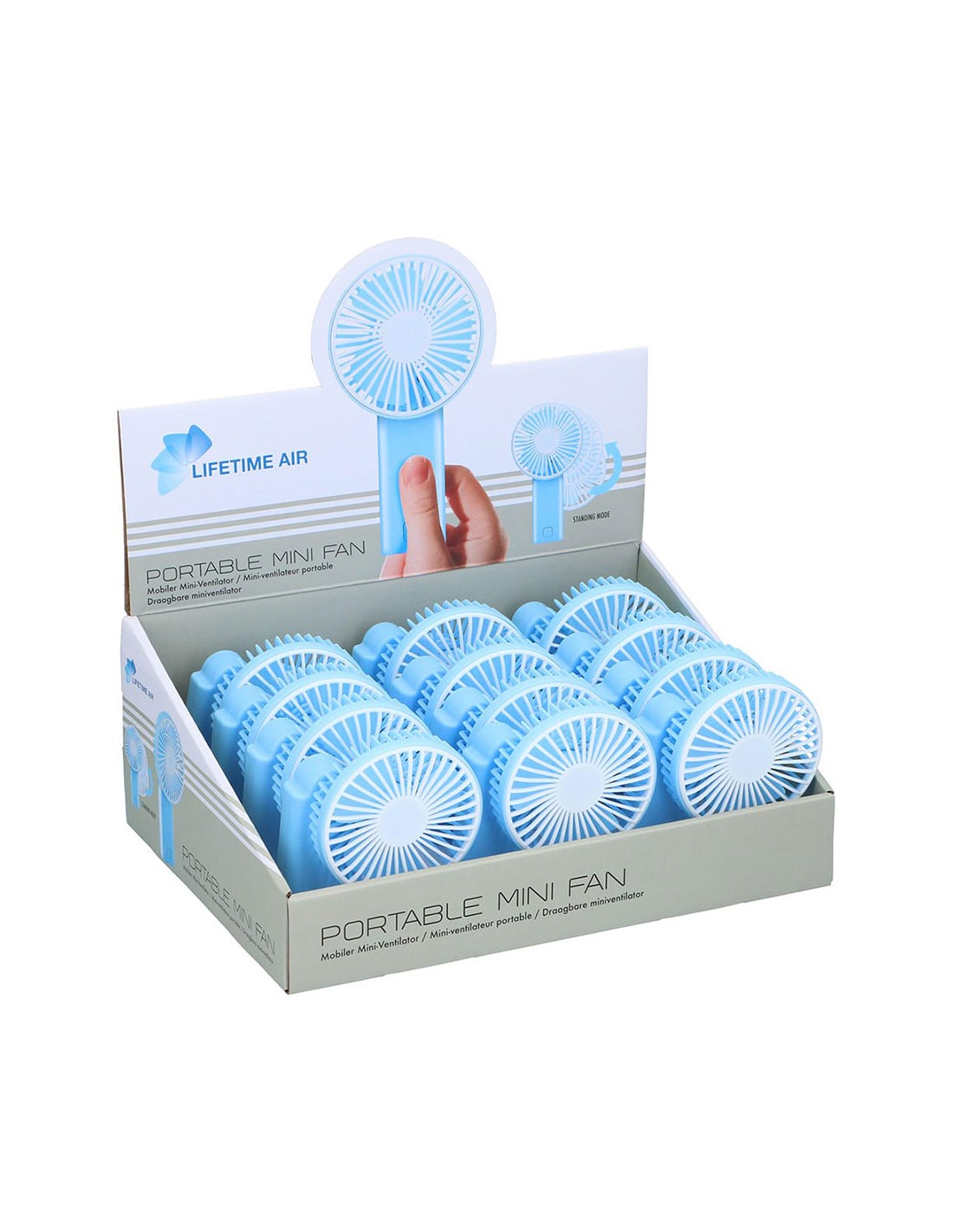 Mini ventilador de mano 2 x aa ( no incluidas) con cabezal multiposición color azul medidas: 9 x 4,5 x 15,5 cm, presentado en expositor de 12 uds
