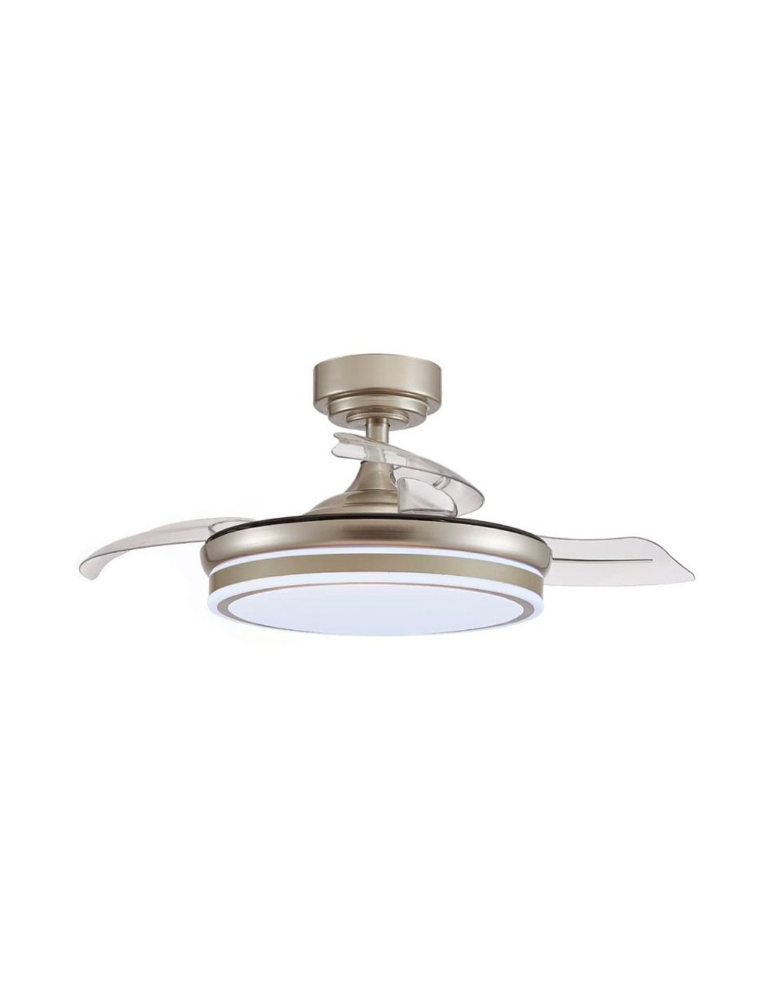 Ventilador de techo níquel, led 3cct, modelo moss mini, ultra silencioso, con 3 aspas retráctiles de abs transparentes con motor dc, 46 w, ip20 db máx 39. dimmable, tipo de luz: luz cálida 3000 k, luz día 4000 k, luz fría 5700 k, 5520 lm, 6 velocidades. rpm máx 260. función inversa invierno-verano, función brisa, temporizador 1/2/4 h, memoria de encendido cct, luz noche con mando a distancia y soporte de pared para mando incluidos (pilas 2 x aaa no incluidas). flujo del aire: máx. 5580 m³/h. vida útil: 20.000 h. 220-240 v 50 hz, dimensiones: con aspas ø92 cm, plafón ø39 cm, altura 32 - 42 cm