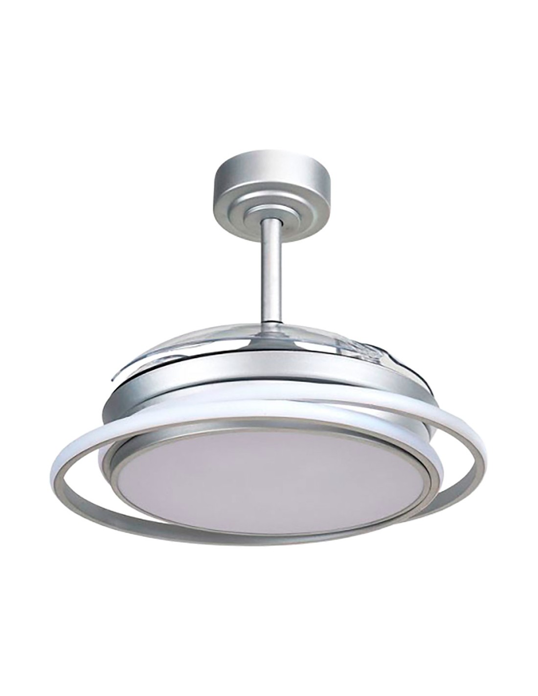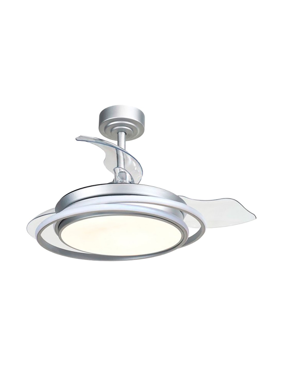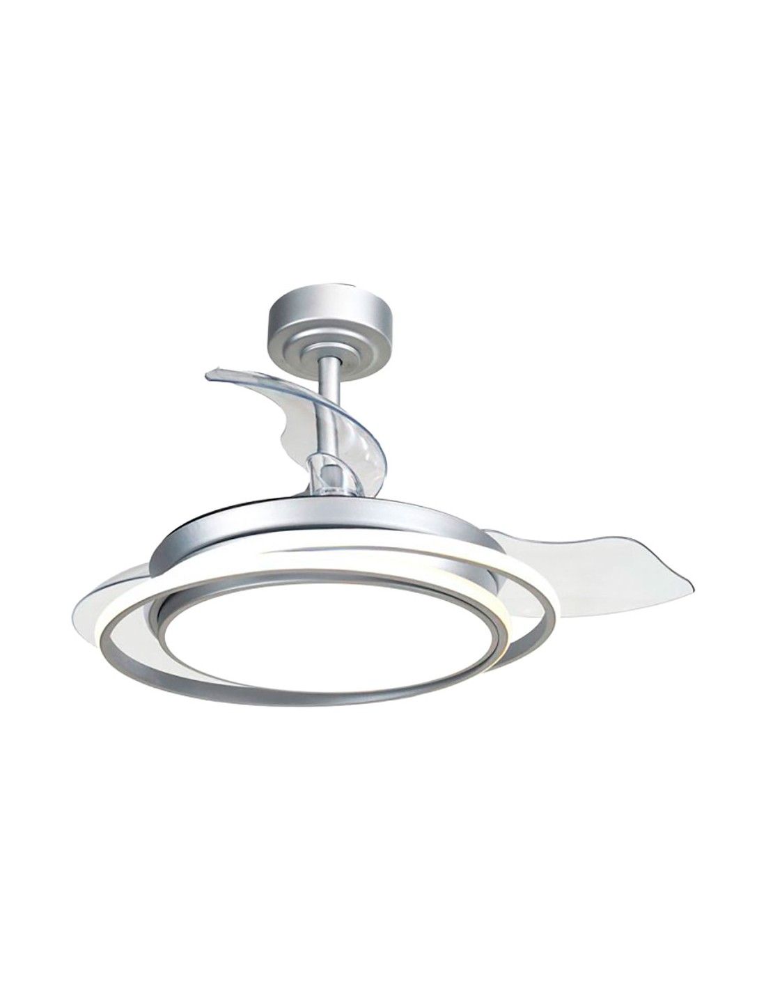 Ventilador de techo plata led 3cct modelo antila mini, ultra silencioso, con 3 aspas retráctiles de abs transparentes con motor dc, 40 w, ip20 db max 41. dimmable, tipo de luz: luz cálida 3000 k, luz día 4000 k, luz fría 5700 k, 4000 lm, 6 velocidades. rpm máx. 258. función inversa invierno-verano, función brisa, temporizador 2/4 h, memoria de encendido cct, luz noche con mando a distancia y soporte de pared para mando incluidos (pilas 2 x aaa no incluidas). flujo del aire: máx. 7165 m³/h. vida útil: 20.000 h. 220-240 v 50 hz, dimensiones: aspas ø92 cm, plafón ø40 cm, altura 38 - 48 cm
