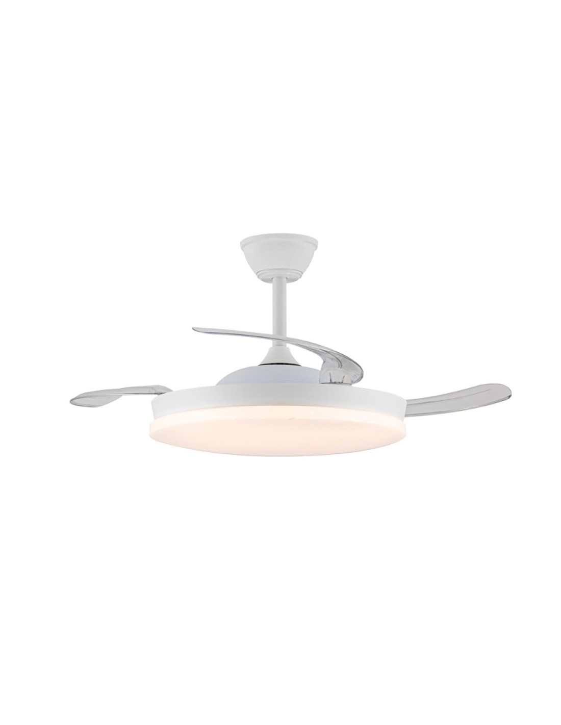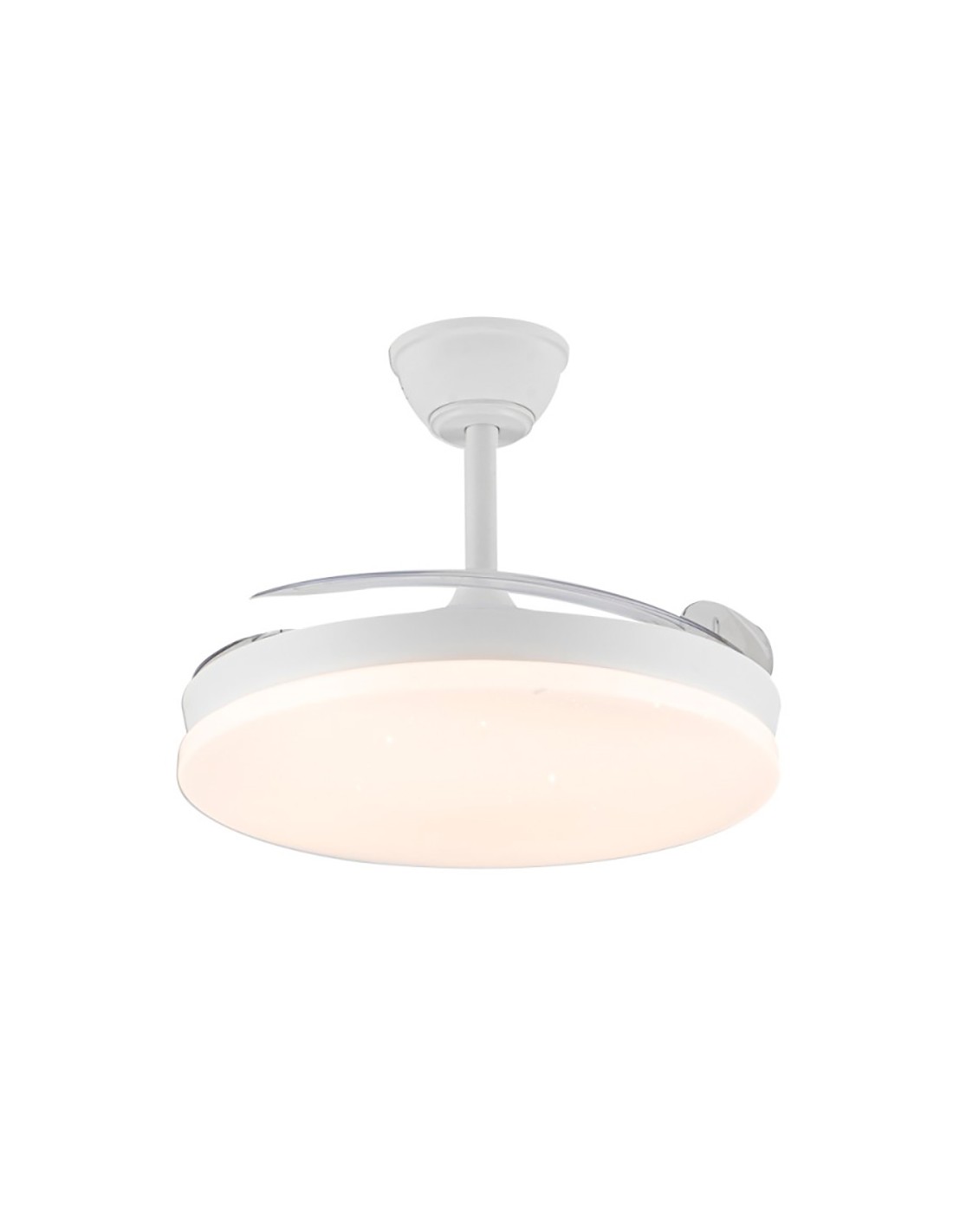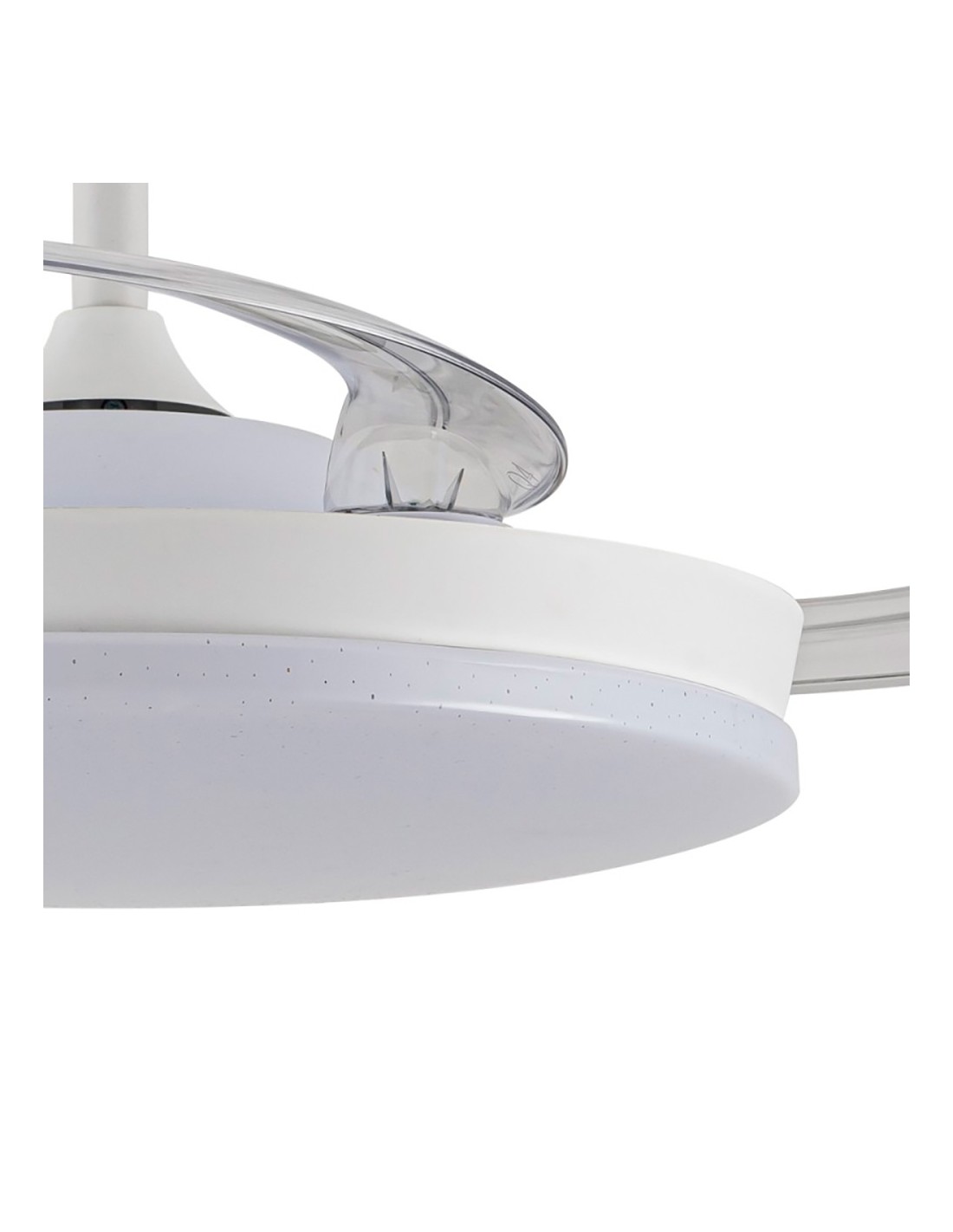 Ventilador de techo, blanco, led 3cct, modelo stars evo smart, silencioso, con 3 aspas retráctiles de abs transparentes con motor dc, 72 w, ip20 db máx 43. dimmable, tipo de luz: luz cálida 3000 k, luz día 4000 k, luz fría 5700 k, 7920 im, 6 velocidades. rpm máx 268. función inversa invierno-verano, función brisa. difusor de pmma con un decorativo efecto de estrellas, temporizador 1/2/4 h, memoria de encendido cct, luz noche con mando a distancia y soporte de pared para mando incluidos (pilas 2 x aaa no incluidas) o con tu smartphone vía app smart descargable con qr. flujo del aire máx. 6580 m³/h. vida útil: 20.000 h, 220-240 v 50 hz, dimensiones: con aspas ø106 cm, plafón ø48,5 cm, altura 34 - 44 cm