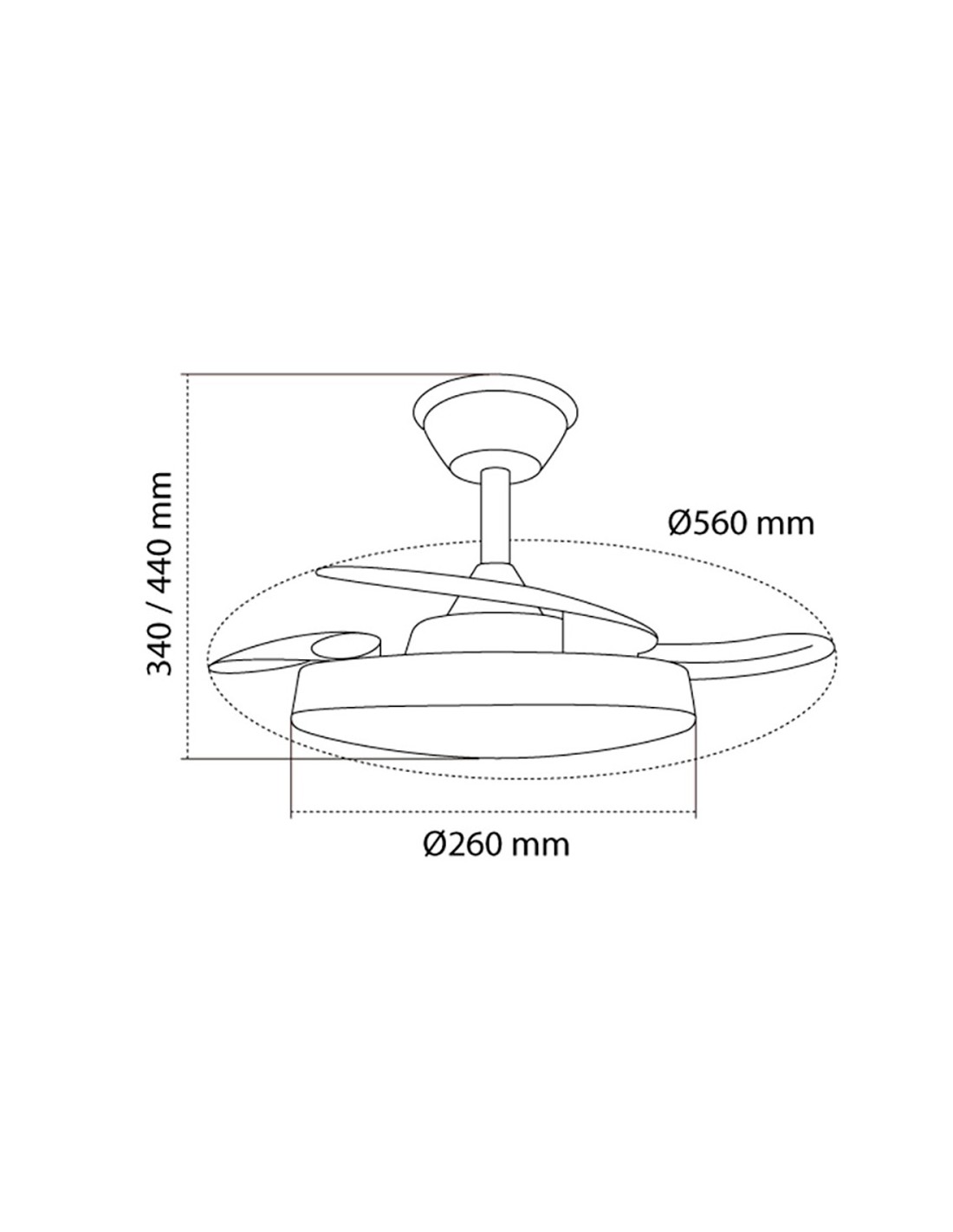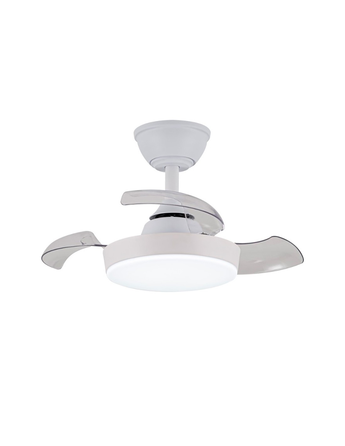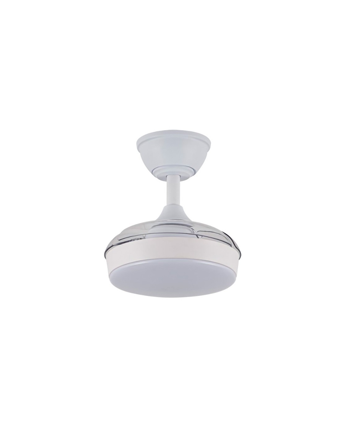 Ventilador de techo blanco, led 3cct, hornet, 32 w, 3195 lm, silencioso, con 3 aspas retráctiles de abs transparentes con motor dc, ip20 db máx 34. dimmable, tipo de luz: luz cálida 3000 k, luz día 4000 k, luz fría 5700 k, 6 velocidades. rpm máx 283. función inversa invierno-verano, función brisa, temporizador 1/2/4 h, memoria de encendido cct luz noche, con mando a distancia y soporte de pared para mando incluidos (pilas 2 x aaa no incluidas). flujo del aire máx: 6148 m³/h. vida útil: 20.000 h. 220-240 v 50 hz, dimensiones: con aspas ø56 cm, plafón ø26 cm, altura 34 - 44 cm