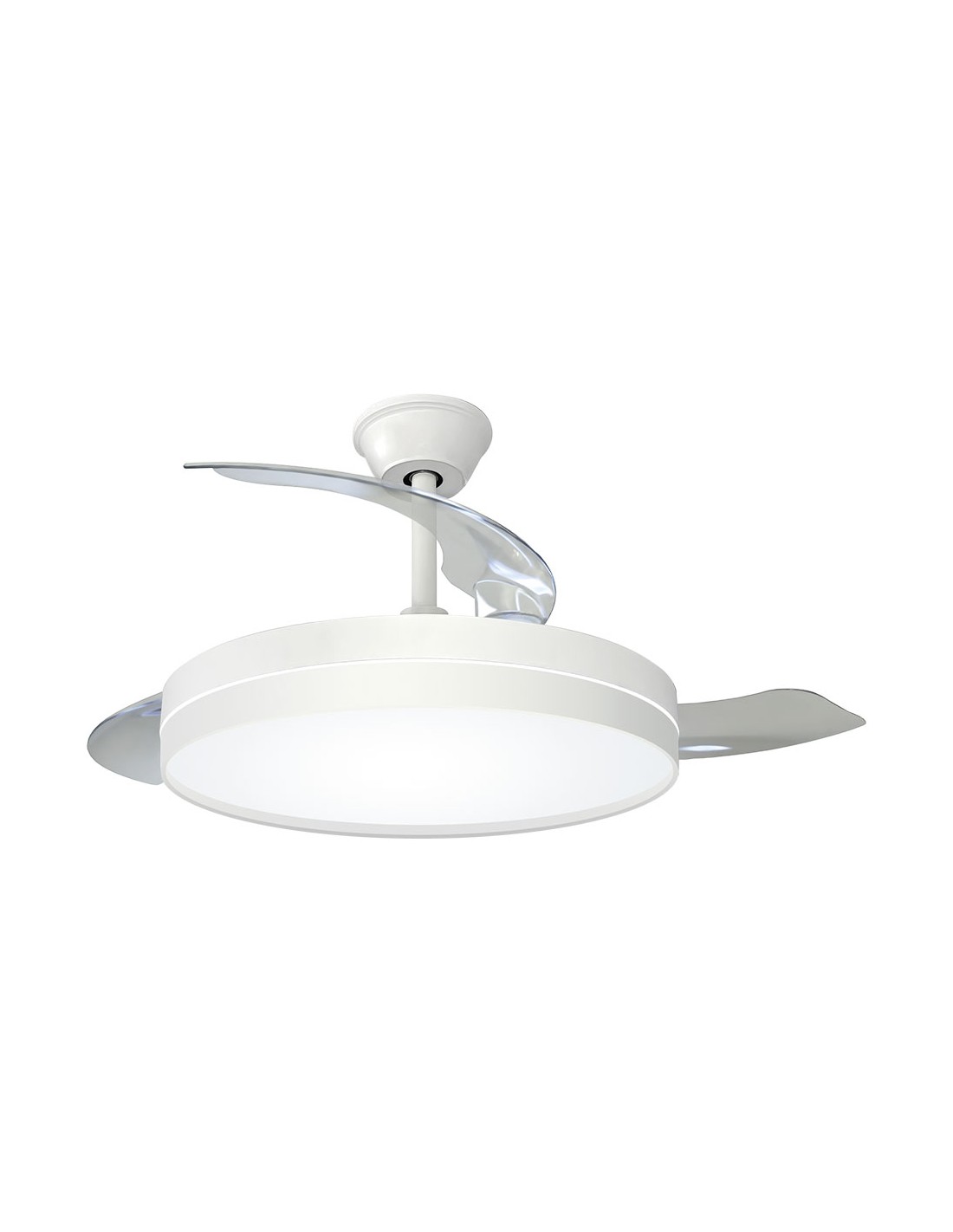 Ventilador de techo, blanco, 3cct, silencioso, con 3 aspas transparentes retráctiles. motor dc, 36 w. tipo de luz: luz cálida 3000 k, luz día 4000 k, luz fría 6500 k, 4100 lm, 6 velocidades. función inversa función verano las aspas giran en sentido contrario a las agujas del reloj y función invierno giran en el sentido de las agujas del reloj. incluye mando a distancia flujo de aire máximo 6141 m³/h tensión 220-240 v~50hz. dimensiones con aspas abiertas 107 x 31 cm con aspas cerradas 48,7 x 31 cm