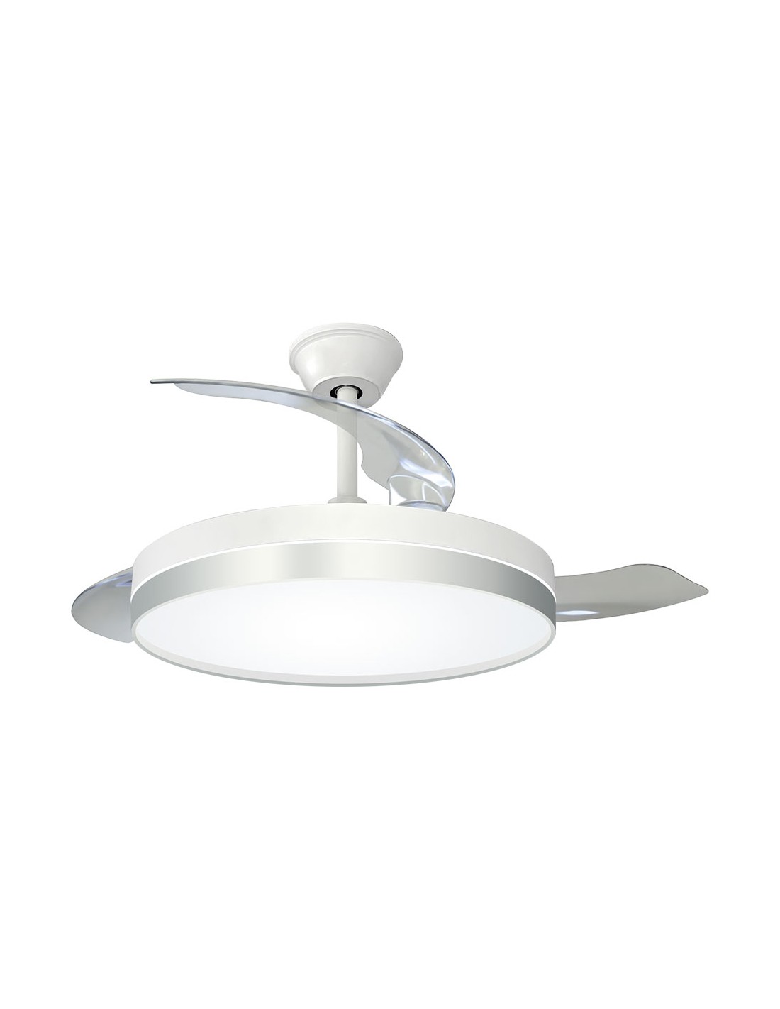 Ventilador de techo, plateado, 3cct, silencioso, con 3 aspas transparentes retráctiles. motor dc, 36 w. tipo de luz: luz cálida 3000 k, luz día 4000 k, luz fría 6500 k, 4100 lm, 6 velocidades. función inversa función verano las aspas giran en sentido contrario a las agujas del reloj y función invierno giran en el sentido de las agujas del reloj. incluye mando a distancia flujo de aire máximo 6141 m³/h tensión 220-240 v~50hz. dimensiones con aspas abiertas 107 x 31 cm con aspas cerradas 48,7 x 31 cm